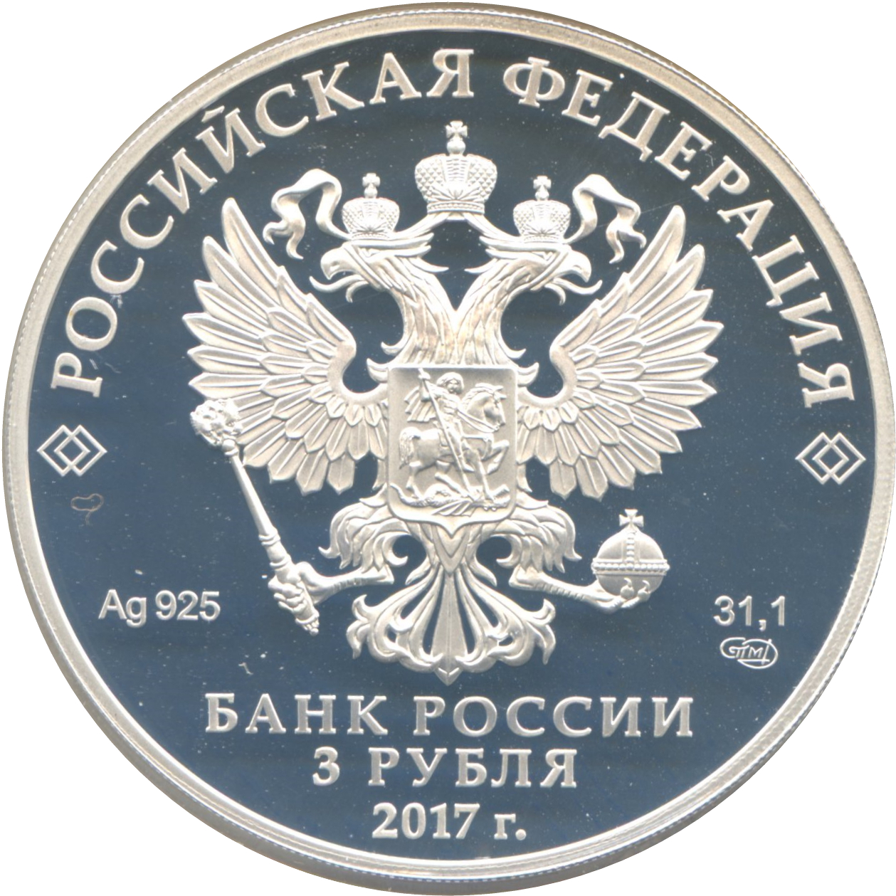 Описание: На дзеркальному полі диска – рельєфне зображення Державного герба Російської Федерації, над ним – напівкругла напис по колу: «РОССИЙСКАЯ ФЕДЕРАЦИЯ» (РОСІЙСЬКА ФЕДЕРАЦІЯ), обрамлена з обох боків подвійними ромбами, нижче під гербом: ліворуч – позначення дорогоцінного металу та його проби, праворуч – вміст дорогоцінного металу та знак монетного двору, внизу по центру, у три рядки – напис: «БАНК РОССИИ» (БАНК РОСІЇ), номінал монети: «3 РУБЛЯ» (3 РУБЛІ), рік.
