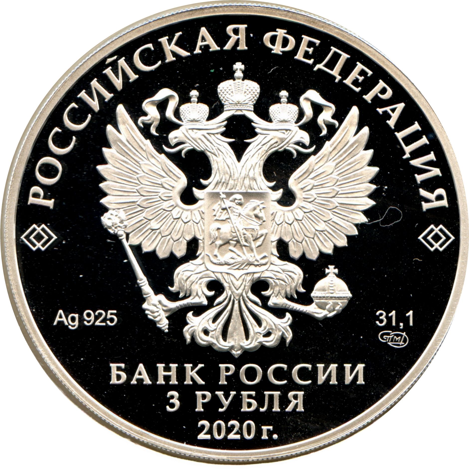 Описание: На дзеркальному полі диска зображено рельєфний герб Російської Федерації, над ним по колу розміщено напівкруглий напис «РОССИЙСКАЯ ФЕДЕРАЦИЯ» (РОСІЙСЬКА ФЕДЕРАЦІЯ), обрамлене з обох боків подвійними ромбами, нижче під гербом зліва вказано дорогоцінний метал і його пробу, а праворуч — вміст дорогоцінного металу і знак монетного двору, внизу по центру трьома рядками розміщено напис «БАНК РОССИИ» (БАНК РОСІЇ), номінал монети «3 РУБЛЯ» (3 РУБЛІ) і рік випуску «2020 г.» (2020).