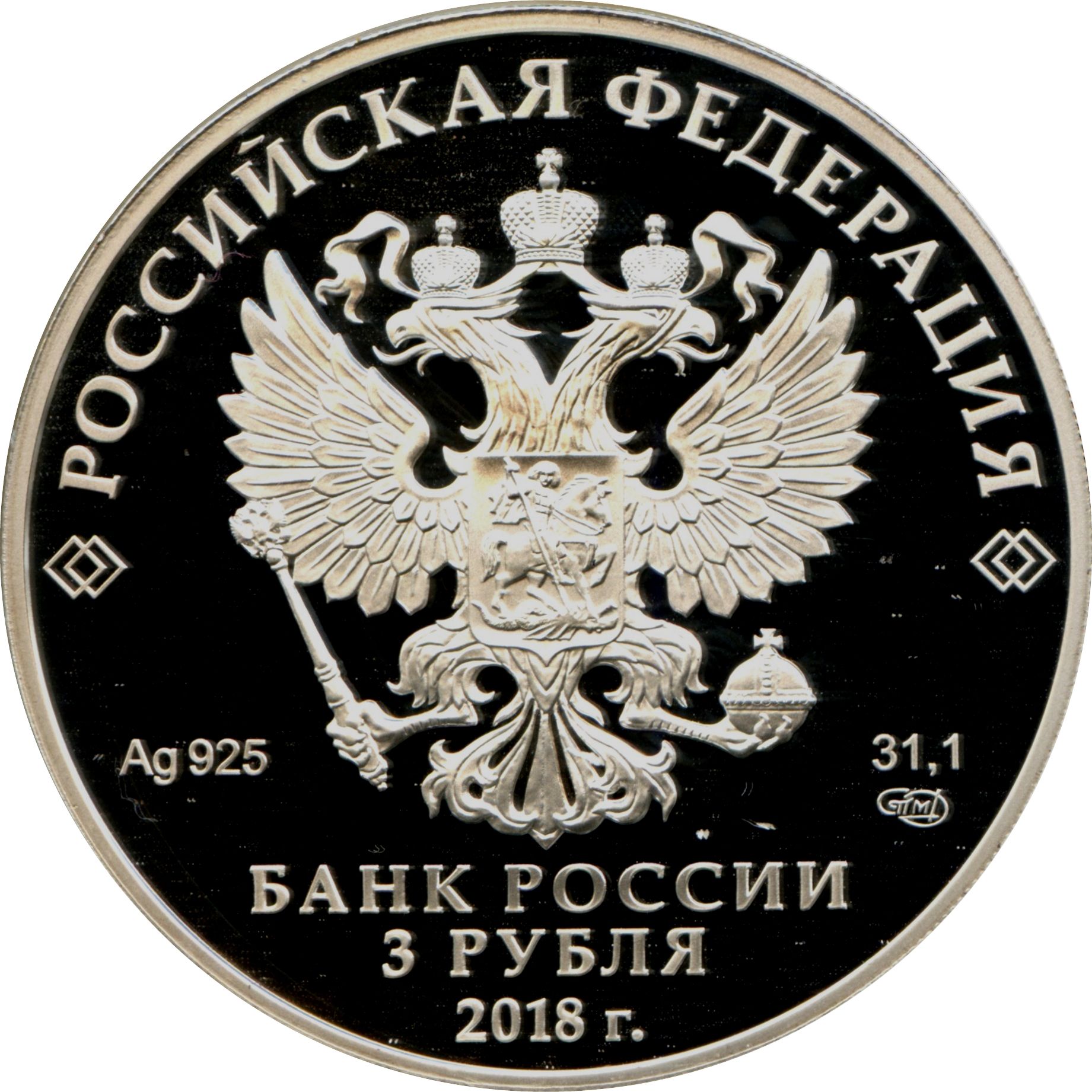 Описание: На дзеркальному полі диска – рельєфне зображення Державного герба Російської Федерації, над ним – напівкругла напис по колу: «РОССИЙСКАЯ ФЕДЕРАЦИЯ» (РОСІЙСЬКА ФЕДЕРАЦІЯ), обрамлений з обох боків подвійними ромбами, нижче під гербом: ліворуч – позначення дорогоцінного металу та його проби, праворуч – вміст дорогоцінного металу та знак монетного двору, внизу по центру, у три рядки – напис: «БАНК РОССИИ» (БАНК РОСІЇ), номінал монети: «3 РУБЛЯ» (3 РУБЛІ), рік.