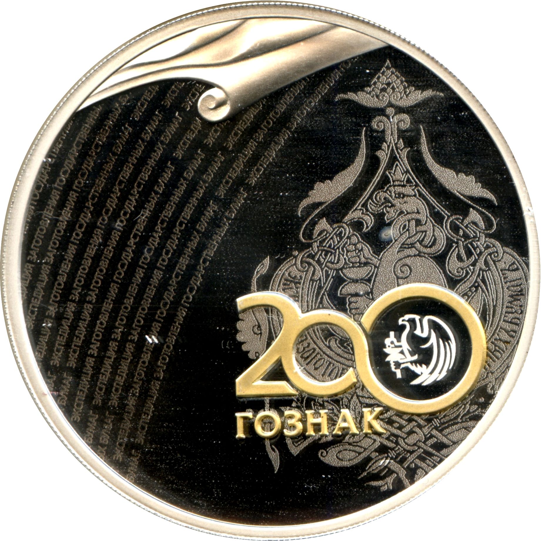 Описание: На дзеркальному полі диска праворуч — позолочене зображення емблеми, присвячене 200-річчю заснування Експедиторного агентства державного паперового запасу, на тлі якого зображено логотип компанії з 1900 року, ліворуч — мікротекст, що складається з повторюваного назви компанії «ЭКСПЕДИЦИЯ ЗАГОТОВЛЕНИЯ ГОСУДАРСТВЕННЫХ БУМАГ» (ЕКСПЕДИЦІЯ ЗАГОТОВЛЕННЯ ДЕРЖАВНИХ БУМАГ), над ним стилізоване зображення аркушів паперу.
