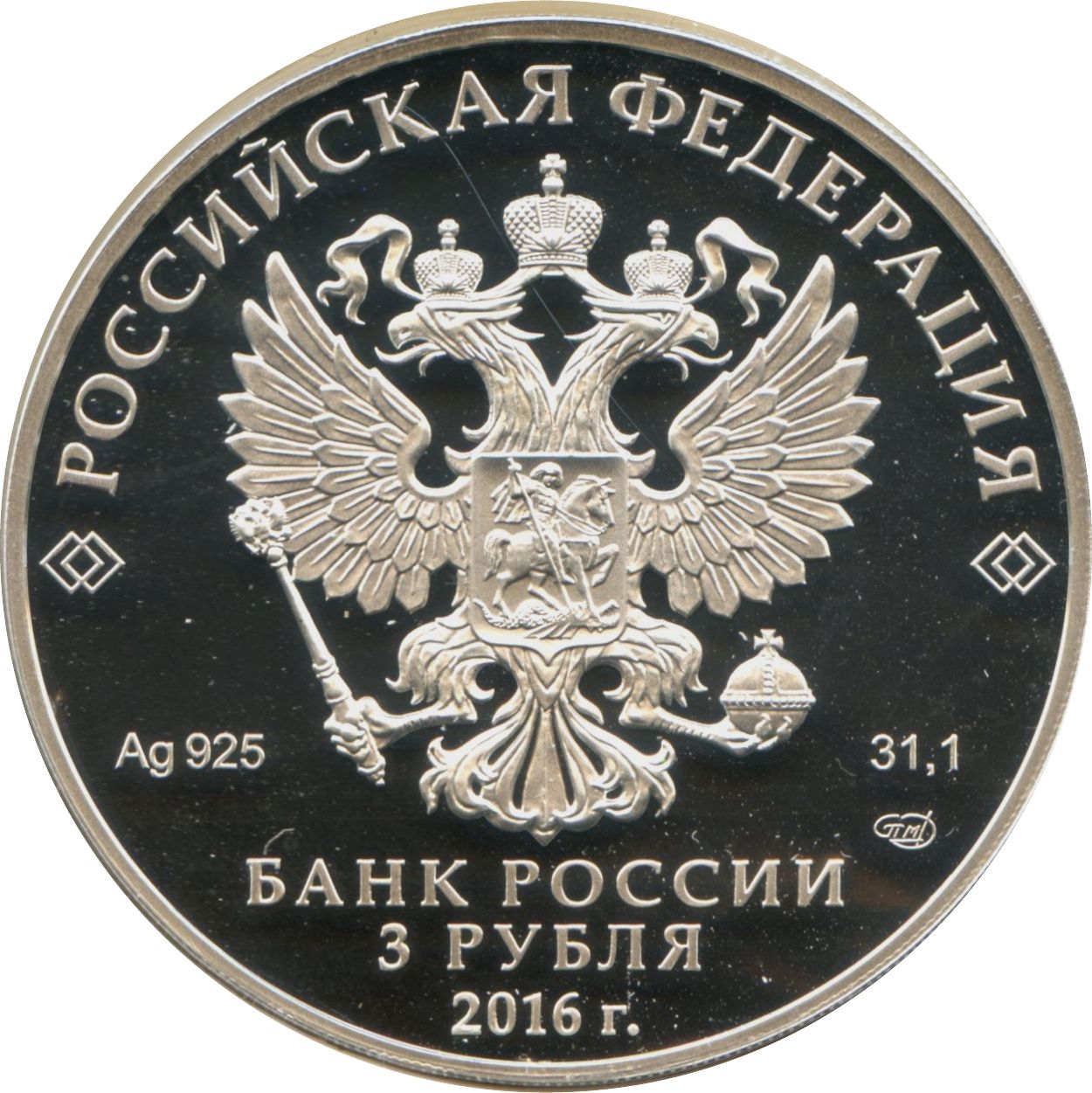 Описание: На дзеркальному полі диска – рельєфне зображення Державного герба Російської Федерації, над ним – напівкругла напис по колу: «РОССИЙСКАЯ ФЕДЕРАЦИЯ» (РОСІЙСЬКА ФЕДЕРАЦІЯ), обрамлене з обох боків подвійними ромбами, нижче під гербом: ліворуч – позначення дорогоцінного металу та його проби, праворуч – вміст дорогоцінного металу та торговельна марка монетного двору, внизу по центру, у три рядки – напис: «БАНК РОССИИ» (БАНК РОСІЇ), номінал монети: «3 РУБЛЯ» (3 РУБЛІ), рік випуску: «2016 г.» (2016).