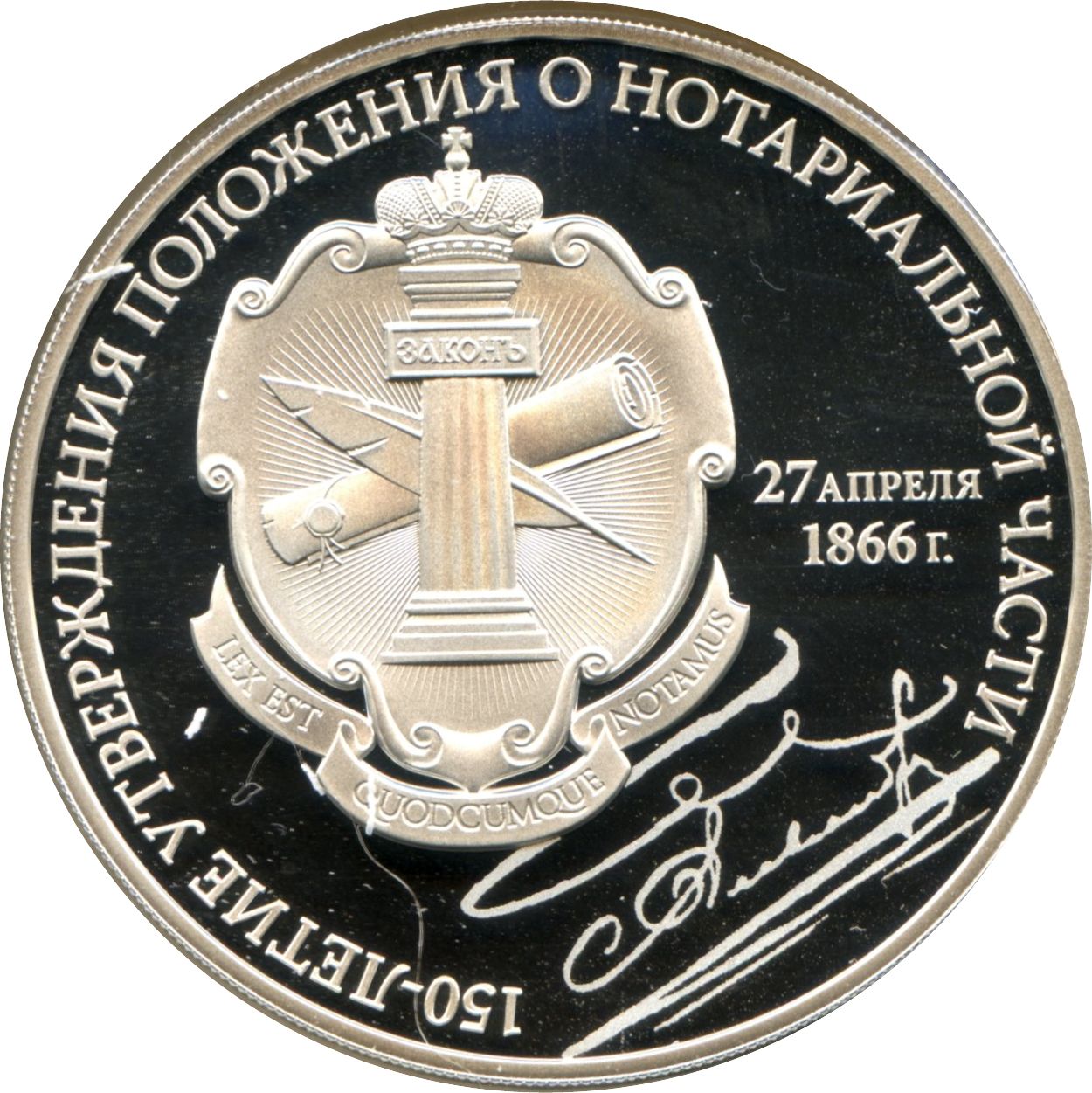 Описание: На дзеркальному полі диска ліворуч — зображення знака-емблеми Федеральної нотаріальної палати, праворуч від знака-емблеми — дата затвердження Олександром II документа про встановлення нотаріального устрою в Росії: «27 АПРЕЛЯ 1866 г.». (27 квітня 1866 р.), під емблемою – факсимільний підпис Олександра II, по краю напис: «150-ЛЕТИЕ УТВЕРЖДЕНИЯ ПОЛОЖЕНИЯ О НОТАРИАЛЬНОЙ ЧАСТИ» (150-РІЧЧЯ ЗАСНУВАННЯ НОТАРІАЛЬНОЇ СИСТЕМИ В РОСІЇ).