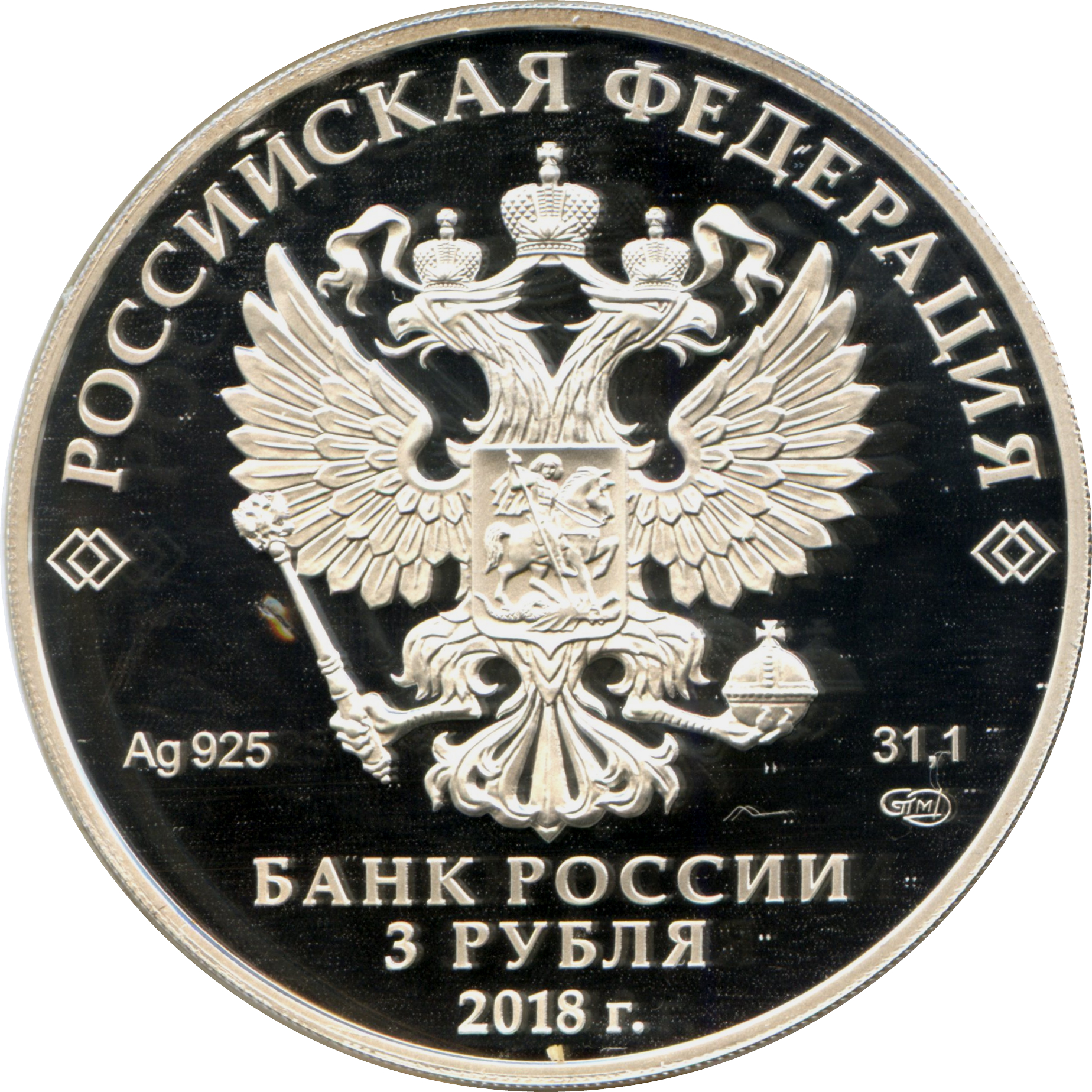 Описание: На дзеркальному полі диска – рельєфне зображення Державного герба Російської Федерації, над ним – напівкруглий напис по колу: «РОССИЙСКАЯ ФЕДЕРАЦИЯ» (РОСІЙСЬКА ФЕДЕРАЦІЯ), обрамлена з обох боків подвійними ромбами, нижче під гербом: ліворуч – позначення дорогоцінного металу та його проби, праворуч – вміст дорогоцінного металу та знак монетного двору, внизу по центру, у три рядки – напис: «БАНК РОССИИ» (БАНК РОСІЇ), номінал монети: «3 РУБЛЯ» (3 РУБЛІ), рік.