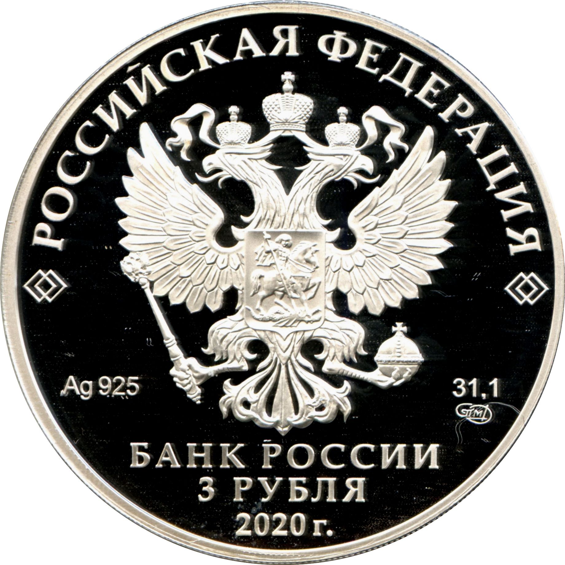 Описание: На дзеркальному полі диска зображено рельєфний герб Російської Федерації, над ним по колу розміщено напівкруглий напис «РОССИЙСКАЯ ФЕДЕРАЦИЯ» (РОСІЙСЬКА ФЕДЕРАЦІЯ), обрамлене з обох боків подвійними ромбами, нижче під гербом зліва вказано дорогоцінний метал і його пробу, а праворуч — вміст дорогоцінного металу та знак монетного двору, внизу по центру трьома рядками розміщено напис «БАНК РОССИИ» (БАНК РОСІЇ), номінал монети «3 РУБЛЯ» (3 РУБЛІ) і рік випуску «2020 г.» (2020).