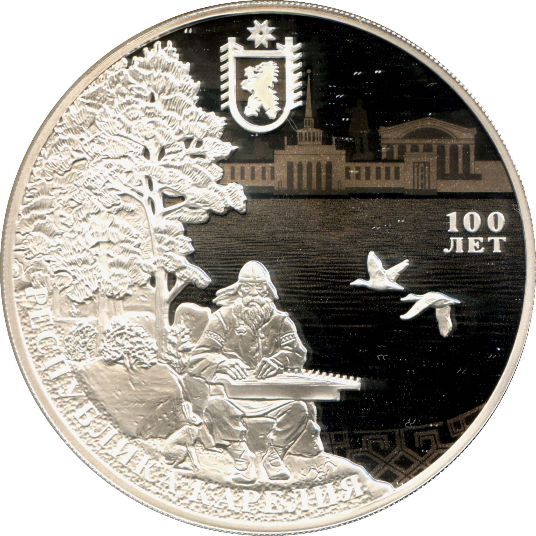 Описание: На дзеркальній поверхні диска зображено рельєфні зображення емблеми Республіки Карелія, фігуру традиційного виконавця епічних пісень — руноспівця, природний пейзаж, кролика та пару качок, що летять над поверхнею води, стилізоване зображення будівель столиці Карелії, Петрозаводська, на задньому плані та національний орнамент внизу праворуч; є написи: «РЕСПУБЛИКА КАРЕЛИЯ» (РЕСПУБЛІКА КАРЕЛІЯ) внизу ліворуч уздовж краю та «100 ЛЕТ» (100 РОКІВ) праворуч у два рядки.