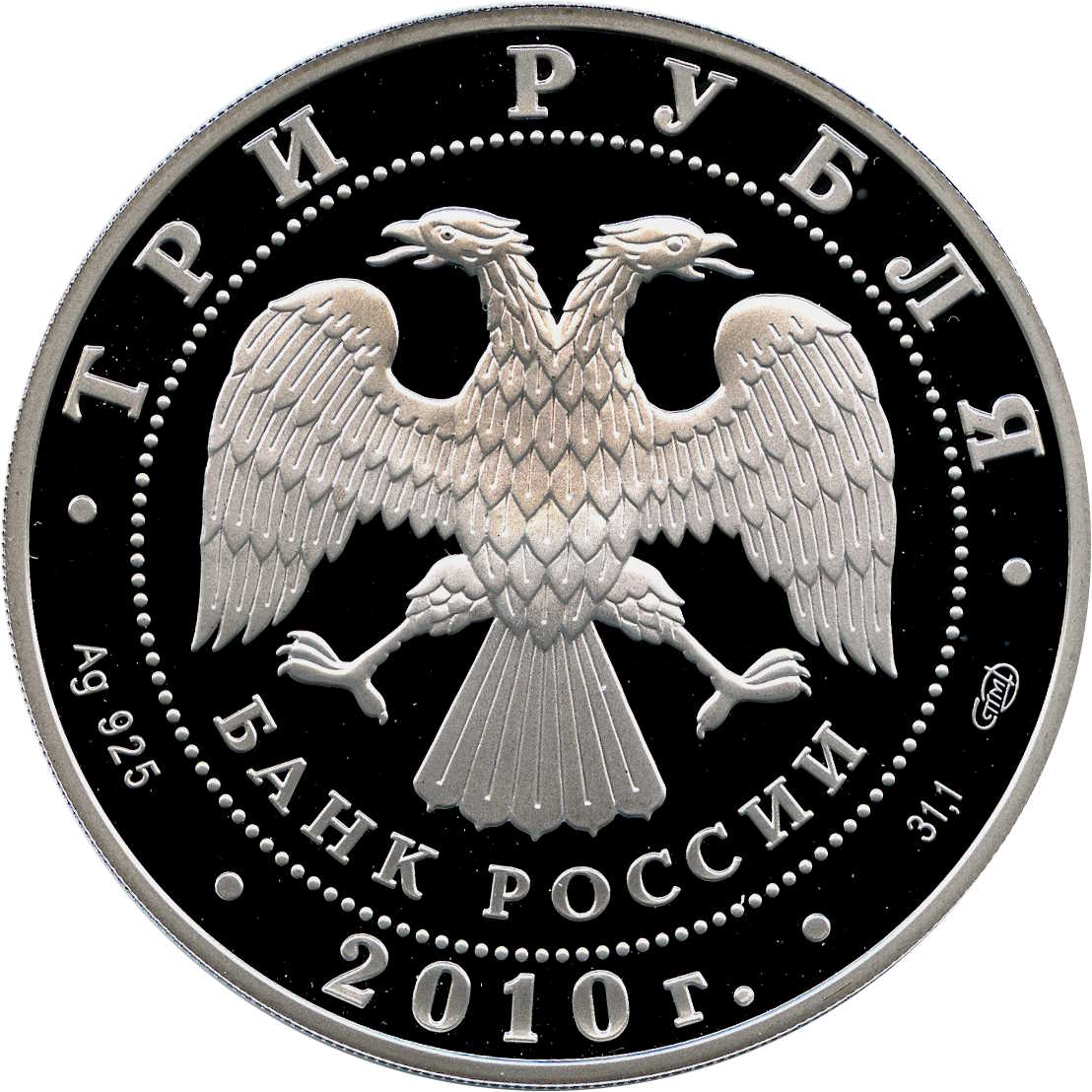 Описание: У центрі — емблема Банку Росії [двоголовий орел із розпростертими крилами, під ним — напівкруглий напис «БАНК РОССИИ» (БАНК РОСІЇ)], обрамлена колом з крапок і написів по краю — зверху: «ТРИ РУБЛЯ», нижче: ліворуч - позначення дорогоцінного металу та його проби, у центрі - рік випуску «2010 г.», праворуч - вміст дорогоцінного металу та знак монетного двору.