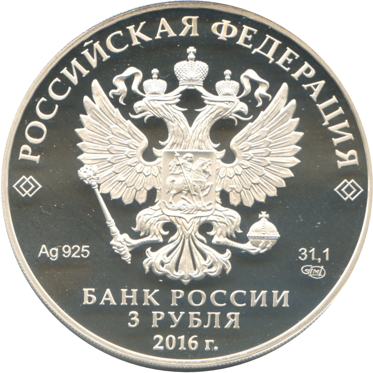 Описание: На дзеркальному полі диска – рельєфне зображення Державного герба Російської Федерації, над ним – напівкругла напис по колу: «РОССИЙСКАЯ ФЕДЕРАЦИЯ» (РОСІЙСЬКА ФЕДЕРАЦІЯ), обрамлений з обох боків подвійними ромбами, нижче під гербом: ліворуч – позначення дорогоцінного металу та його проби, праворуч – вміст дорогоцінного металу та знак монетного двору, внизу по центру, у три рядки – напис: «БАНК РОССИИ» (БАНК РОСІЇ), номінал монети: «3 РУБЛЯ» (3 РУБЛІ), рік.