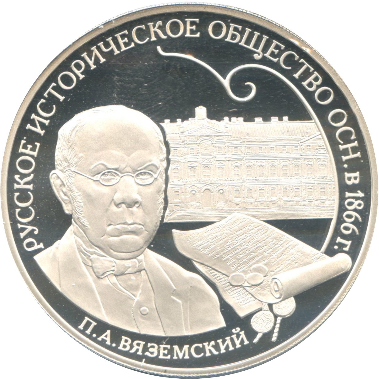 Описание: Рельєфні зображення першого голови Російського історичного товариства П. А. Вяземського на тлі Ново-Михайлівського палацу в Санкт-Петербурзі та сувою. По периметру є написи: РУССКОЕ ИСТОРИЧЕСКОЕ ОБЩЕСТВО ОСН. В 1866 г. (РОСІЙСЬКЕ ІСТОРИЧНЕ ТОВАРИСТВО, ЗАСНОВАНЕ У 1866 Р.) зверху, П А. ВЯЗЕМСКИЙ (П. А. ВЯЗЕМСЬКИЙ) знизу.