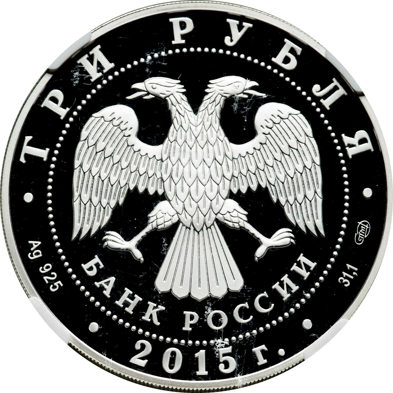 Описание: У центрі — емблема Банку Росії [двоголовий орел із опущеними крилами, під ним — напівкруглий напис «БАНК РОССИИ» (БАНК РОСІЇ)], обрамлена колом з крапок і написів по краю — зверху: «ТРИ РУБЛЯ», нижче: ліворуч – позначення дорогоцінного металу та його проби, у центрі – рік випуску «2015 г.», праворуч – вміст дорогоцінного металу та знак монетного двору.