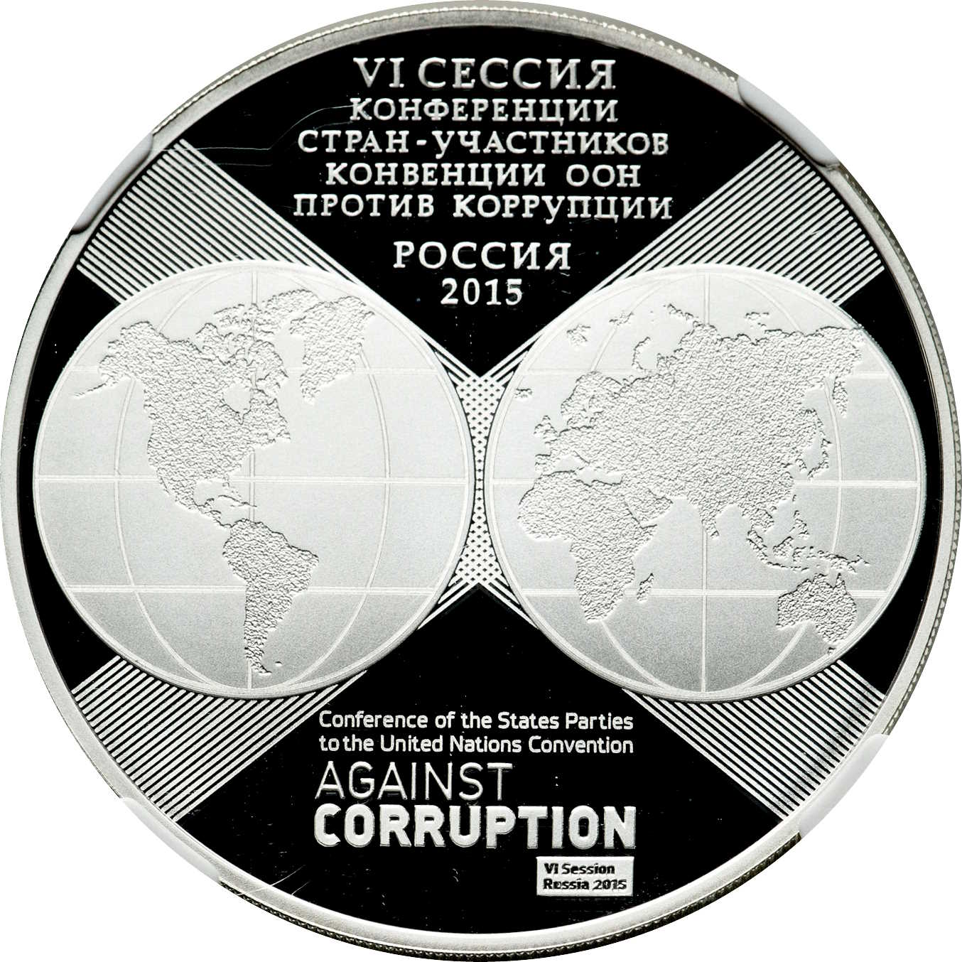 Описание: На дзеркальному полі диска в центрі, на перетині двох смуг, утворених тонкими лініями, — зображення двох півкуль земної кулі з контурами континентів, вище — напис у сім рядків: «VI СЕССИЯ КОНФЕРЕНЦИИ СТРАН-УЧАСТНИКОВ КОНВЕНЦИИ ООН ПРОТИВ КОРРУПЦИИ РОССИЯ 2015» (VI СЕСІЯ КОНФЕРЕНЦІЇ ДЕРЖАВ-УЧАСНИКІВ КОНВЕНЦІЇ ООН ПРОТИ КОРУПЦІЇ), нижче — напис у чотири рядки: «КОНФЕРЕНЦІЯ ДЕРЖАВ-УЧАСНИЦЬ КОНВЕНЦІЇ ООН ПРОТИ КОРУПЦІЇ», під нею праворуч на світлому чотирикутнику: «VI Session Russia 2015».