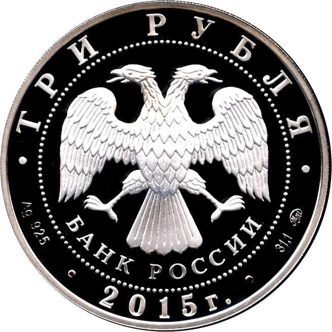 Описание: У центрі — емблема Банку Росії [двоголовий орел із опущеними крилами, під ним — напівкруглий напис «БАНК РОССИИ» (БАНК РОСІЇ)], обрамлена колом з крапок і написів по краю — зверху: «ТРИ РУБЛЯ», нижче: ліворуч – позначення дорогоцінного металу та його проби, у центрі – рік випуску «2015 г.», праворуч – вміст дорогоцінного металу та знак монетного двору.