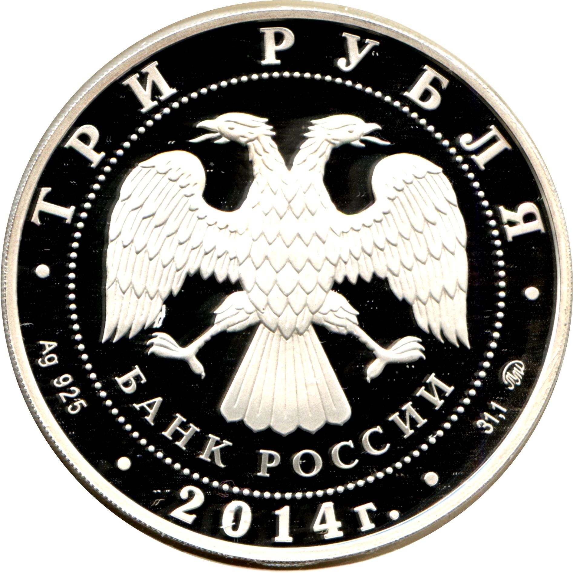 Описание: У центрі — емблема Банку Росії [двоголовий орел із розпростертими крилами, під ним — напівкруглий напис «БАНК РОССИИ» (БАНК РОСІЇ)], обрамлена колом з крапок і написів по краю — зверху: «ТРИ РУБЛЯ», нижче: ліворуч – позначення дорогоцінного металу та його проби, у центрі – дата: «2014 г.», праворуч – вміст дорогоцінного металу та знак монетного двору.