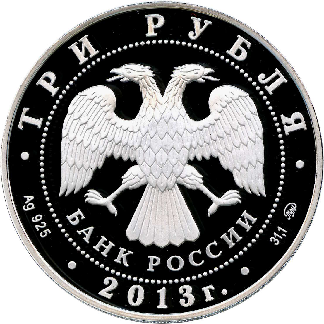 Описание: У центрі — емблема Банку Росії [двоголовий орел із опущеними крилами, під ним — напівкруглий напис «БАНК РОССИИ» (БАНК РОСІЇ)], обрамлена колом з крапок і написів по краю — зверху: «ТРИ РУБЛЯ», нижче: ліворуч - позначення дорогоцінного металу та його проби, в центрі - рік випуску «2013 г.», праворуч - вміст дорогоцінного металу та знак монетного двору.
