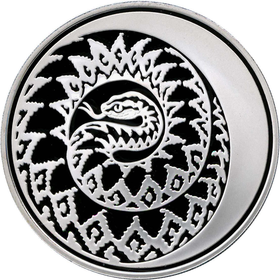 Описание: У колі, обрамленому всім обідком, ліворуч — зображення згорнутої змії, праворуч — матове зображення півмісяця.