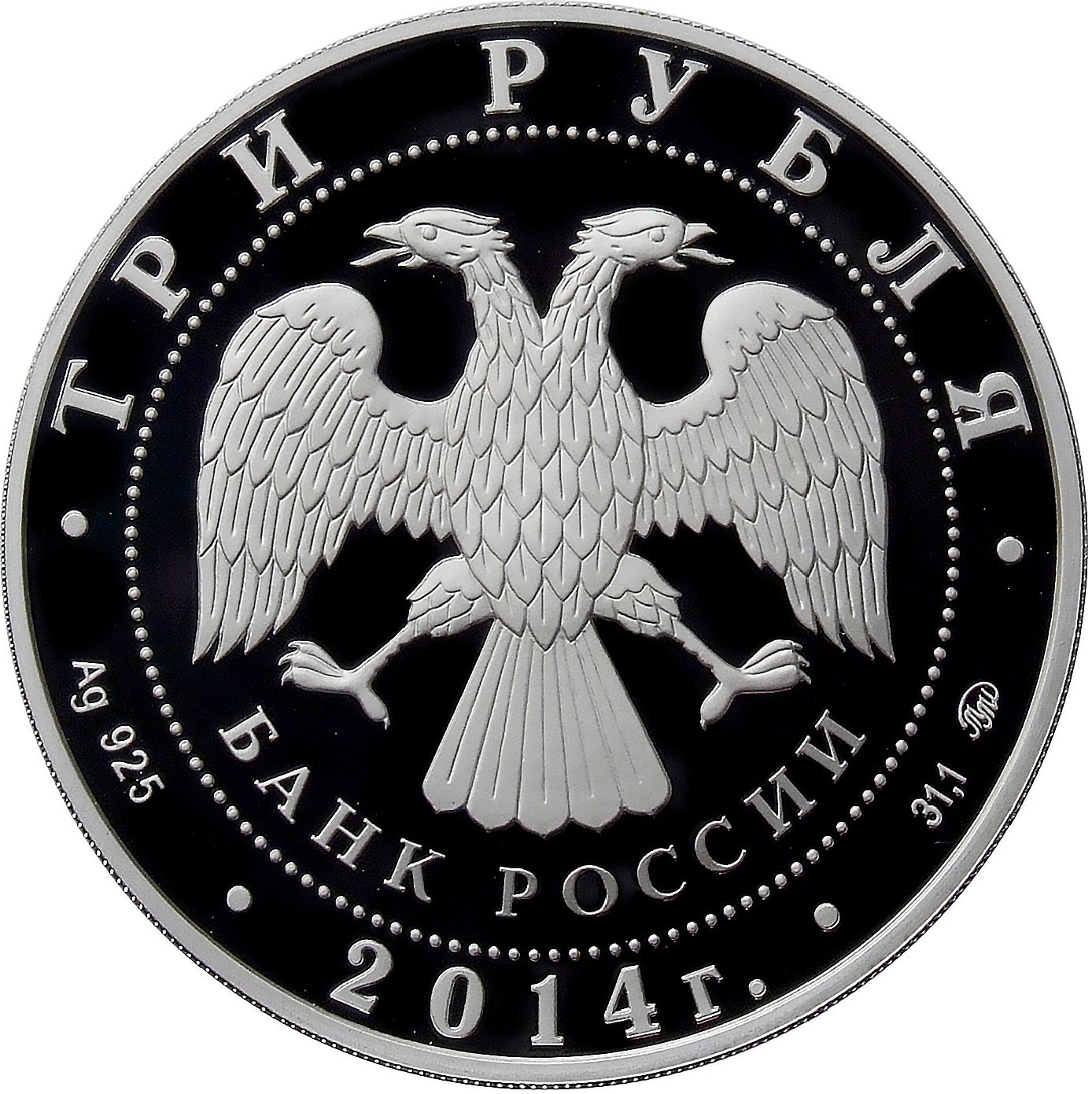 Описание: У центрі — емблема Банку Росії [двоголовий орел із опущеними крилами, під ним — напівкруглий напис «БАНК РОССИИ» (БАНК РОСІЇ)], обрамлена колом з крапок і написів по краю — зверху: «ТРИ РУБЛЯ», нижче: ліворуч – позначення дорогоцінного металу та його проби, у центрі – рік випуску «2014 г.», праворуч – вміст дорогоцінного металу та знак монетного двору.