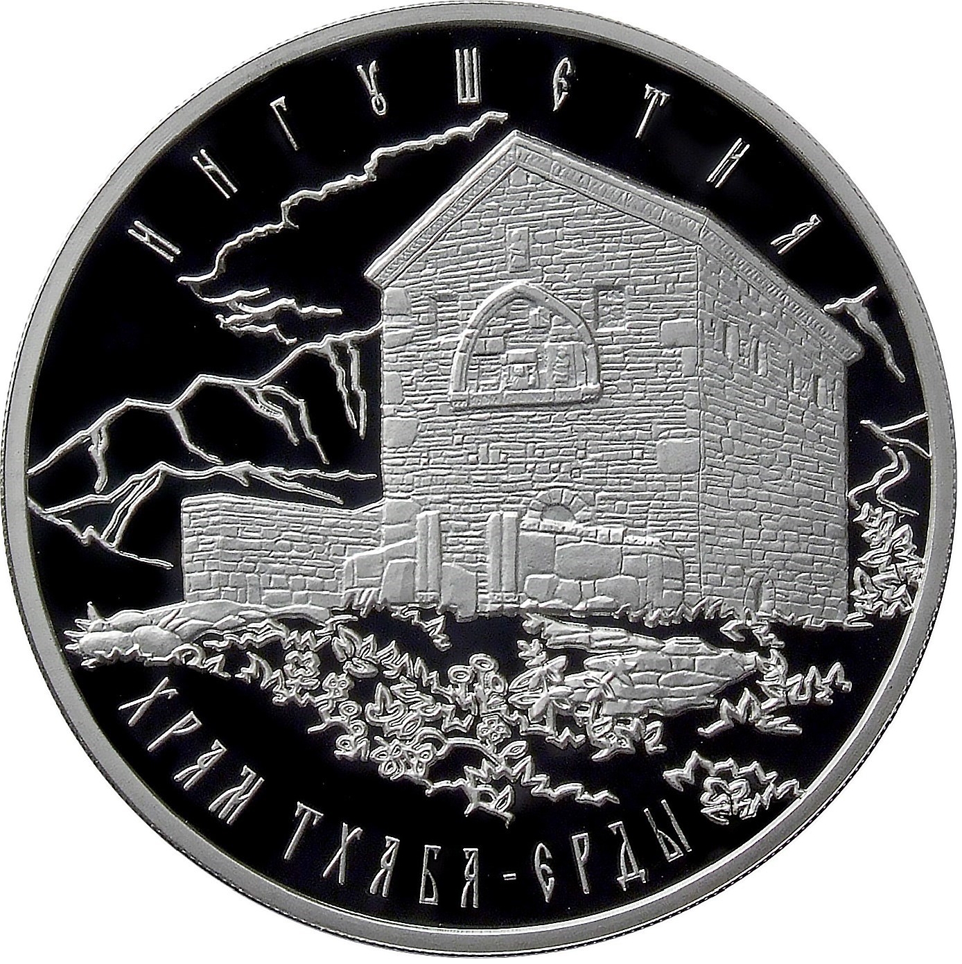 Описание: На дзеркальному полі диска – рельєфне зображення високої кам'яної будівлі під прогонним дахом, ліворуч від неї – руїни стін, по краю – написи, зверху: «ИНГУШЕТИЯ» (ІНГУШЕТІЯ), знизу: «ХРАМ ТХАБА-ЕРДЫ» (ЦЕРКВА ТХАБА-ЄРДИ).