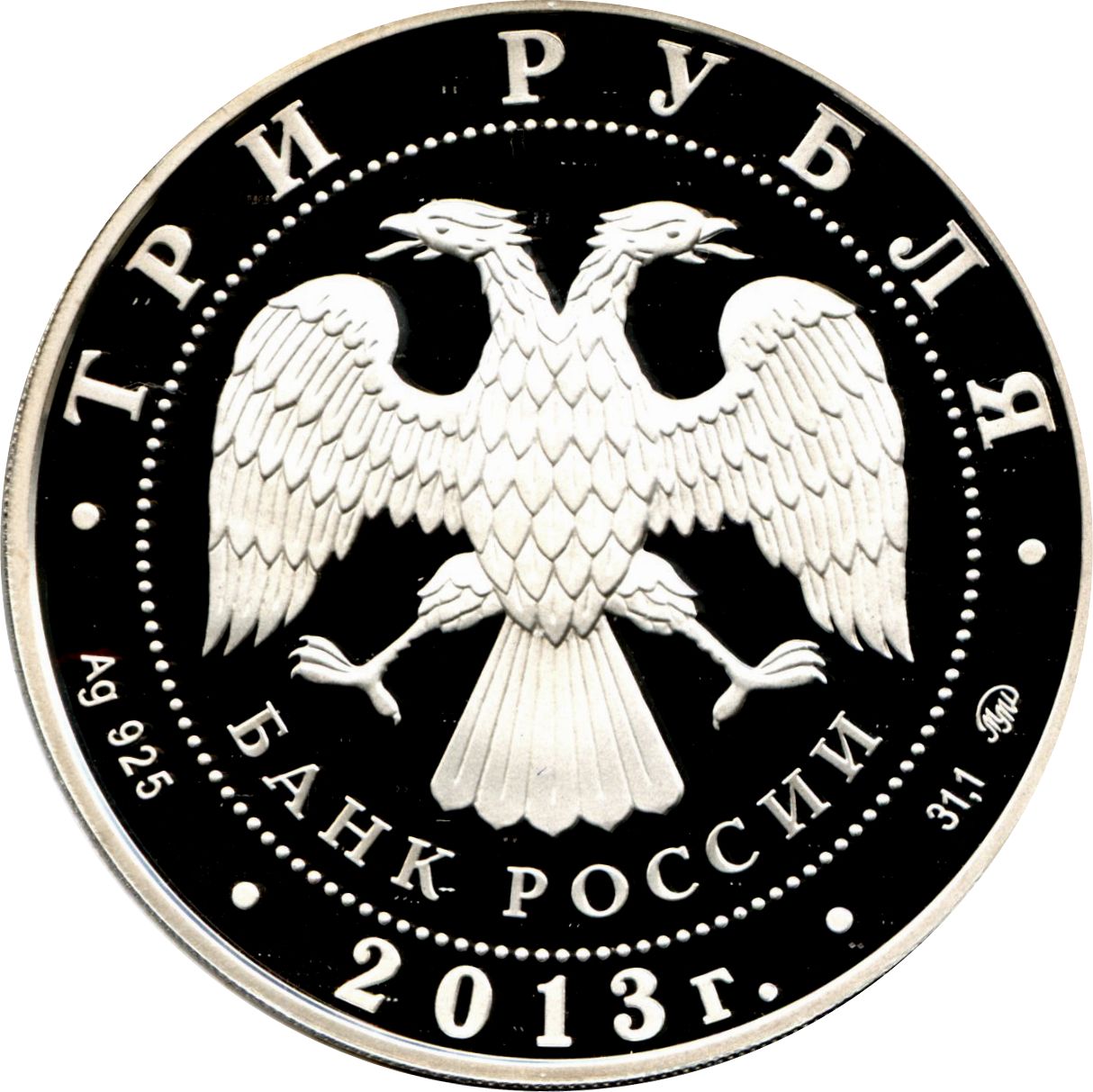 Описание: У центрі — емблема Банку Росії [двоголовий орел зі спущеними крилами, під ним — напівкруглий напис «БАНК РОССИИ» (БАНК РОСІЇ)], обрамлена колом з крапок і написів по краю — зверху: «ТРИ РУБЛЯ», знизу: ліворуч - позначення дорогоцінного металу та його проби, в центрі - рік випуску, праворуч - вміст дорогоцінного металу та знак монетного двору.