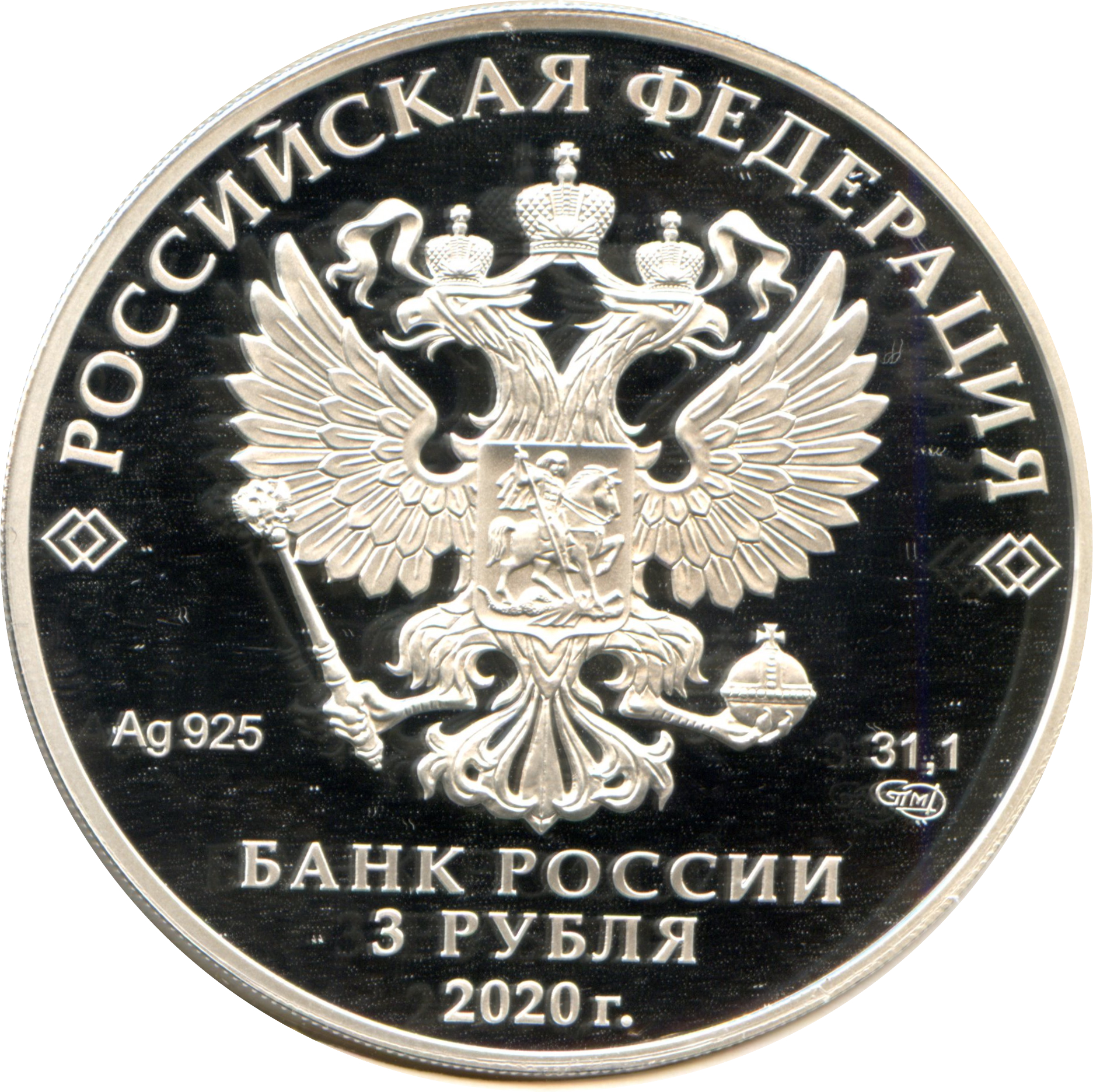 Описание: На дзеркальному полі диска зображено рельєфний герб Російської Федерації, над ним по колу розміщено напівкруглий напис «РОССИЙСКАЯ ФЕДЕРАЦИЯ» (РОСІЙСЬКА ФЕДЕРАЦІЯ), обрамлене з обох боків подвійними ромбами, нижче під гербом зліва вказано дорогоцінний метал і його пробу, а праворуч — вміст дорогоцінного металу та знак монетного двору, внизу по центру трьома рядками розміщено напис «БАНК РОССИИ» (БАНК РОСІЇ), номінал монети «3 РУБЛЯ» (3 РУБЛІ) і рік випуску «2020 г.» (2020).