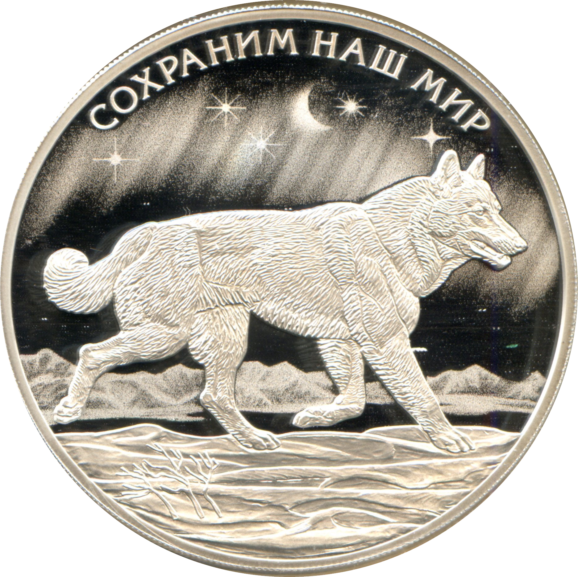 Описание: Рельєфне зображення тундрового вовка на тлі скель і неба з зірками, оброблене лазером для матового покриття; зверху по колу розміщено напис «СОХРАНИМ НАШ МИР» (ЗБЕРЕЖЕМО НАШ СВІТ).
