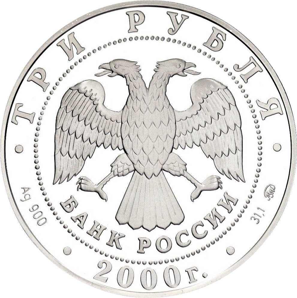 Описание: У центрі — емблема Банку Росії (двоголовий орел, створений І. Білібіним), нижче — напівкруглий напис «БАНК РОССИИ» (БАНК РОСІЇ), обрамлений колом з крапок і написів по краю: вгорі — «ТРИ РУБЛЯ» (ТРИ РУБЛІ), внизу — дата «2000», літери ліворуч позначають метал і пробу, праворуч — вміст дорогоцінного металу і знак монетного двору.