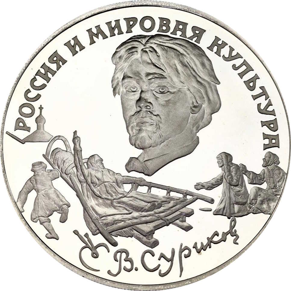 Описание: Автопортрет Василя Сурікова, під ним — фрагменти його картини «Бояриня Морозова» (зліва направо — купол церкви, біжучий хлопчик, бояриня Морозова на санях, мандрівниця та Божий чоловік), нижче — палітра з пензлями та факсимільний підпис художника. Напис у верхній частині по краю — «РОССИЯ И МИРОВАЯ КУЛЬТУРА» (РОСІЯ І СВІТОВА КУЛЬТУРА).