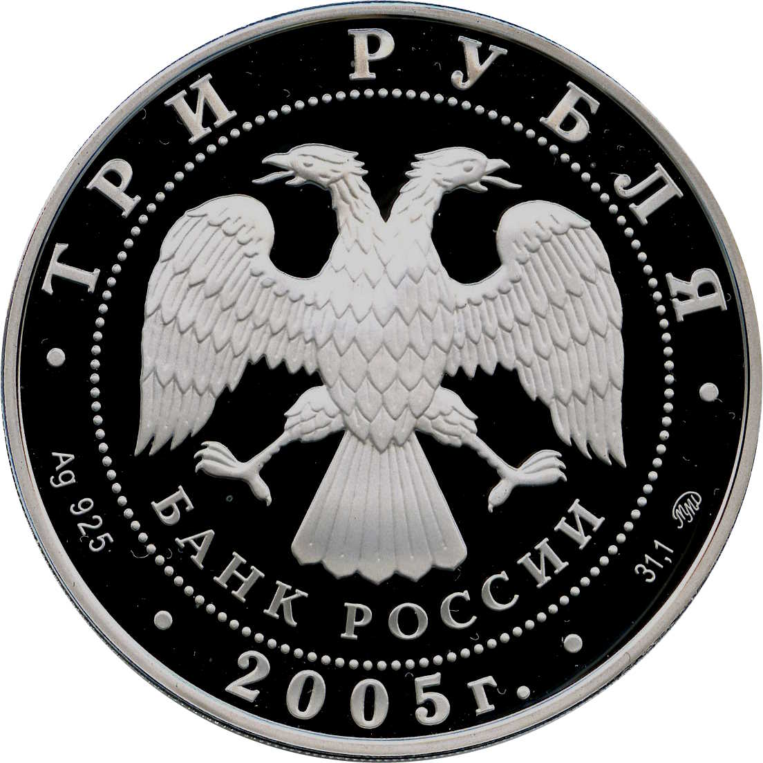 Описание: У центрі — емблема Банку Росії [двоголовий орел із опущеними крилами, нижче — напівкруглий напис — «БАНК РОССИИ» (БАНК РОСІЇ)], обрамлений колом з крапок і написами по краю: вгорі – «ТРИ РУБЛЯ» (ТРИ РУБЛІ), внизу – рік випуску «2005», літери ліворуч позначають метал і пробу, праворуч – вміст дорогоцінного металу і знак монетного двору.