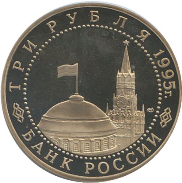 Описание: У центрі — вид на купол будівлі Сенату та Спаську вежу Московського Кремля, праворуч — знак монетного двору. Написи вздовж краю обрамлені колом з крапок: зверху — «ТРИ РУБЛЯ 1995 г.» (ТРИ РУБЛІ 1995), знизу — «БАНК РОССИИ» (БАНК РОСІЇ).