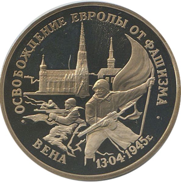 Описание: Троє радянських солдатів під час бойової операції на тлі архітектурних пам'яток Відня, написи вздовж краю розділені двома крапками: зверху — «ОСВОБОЖДЕНИЕ ЕВРОПЫ ОТ ФАШИЗМА» (ВИЗВОЛЕННЯ ЄВРОПИ ВІД ФАШИЗМУ), знизу — «Вена 13.04.1945 г.». (ВІДЕНЬ 13.04.1945).