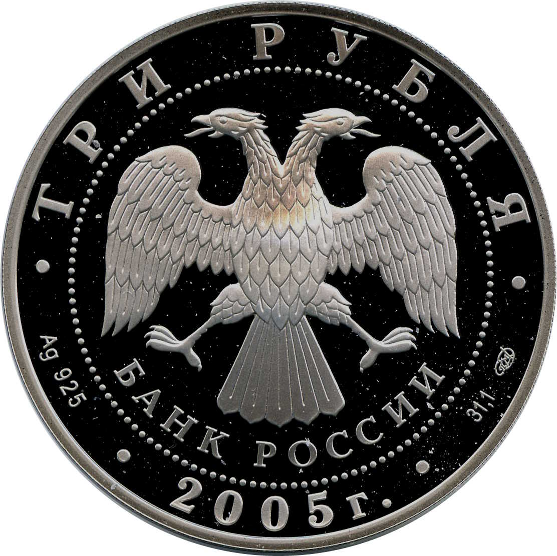 Описание: У центрі — емблема Банку Росії [двоголовий орел із опущеними крилами, нижче — напівкруглий напис — «БАНК РОССИИ» (БАНК РОСІЇ)], обрамлений колом з крапок і написами по краю: вгорі – «ТРИ РУБЛЯ» (ТРИ РУБЛІ), внизу – рік випуску «2005», літери ліворуч позначають метал і пробу, праворуч – вміст дорогоцінного металу і знак монетного двору.