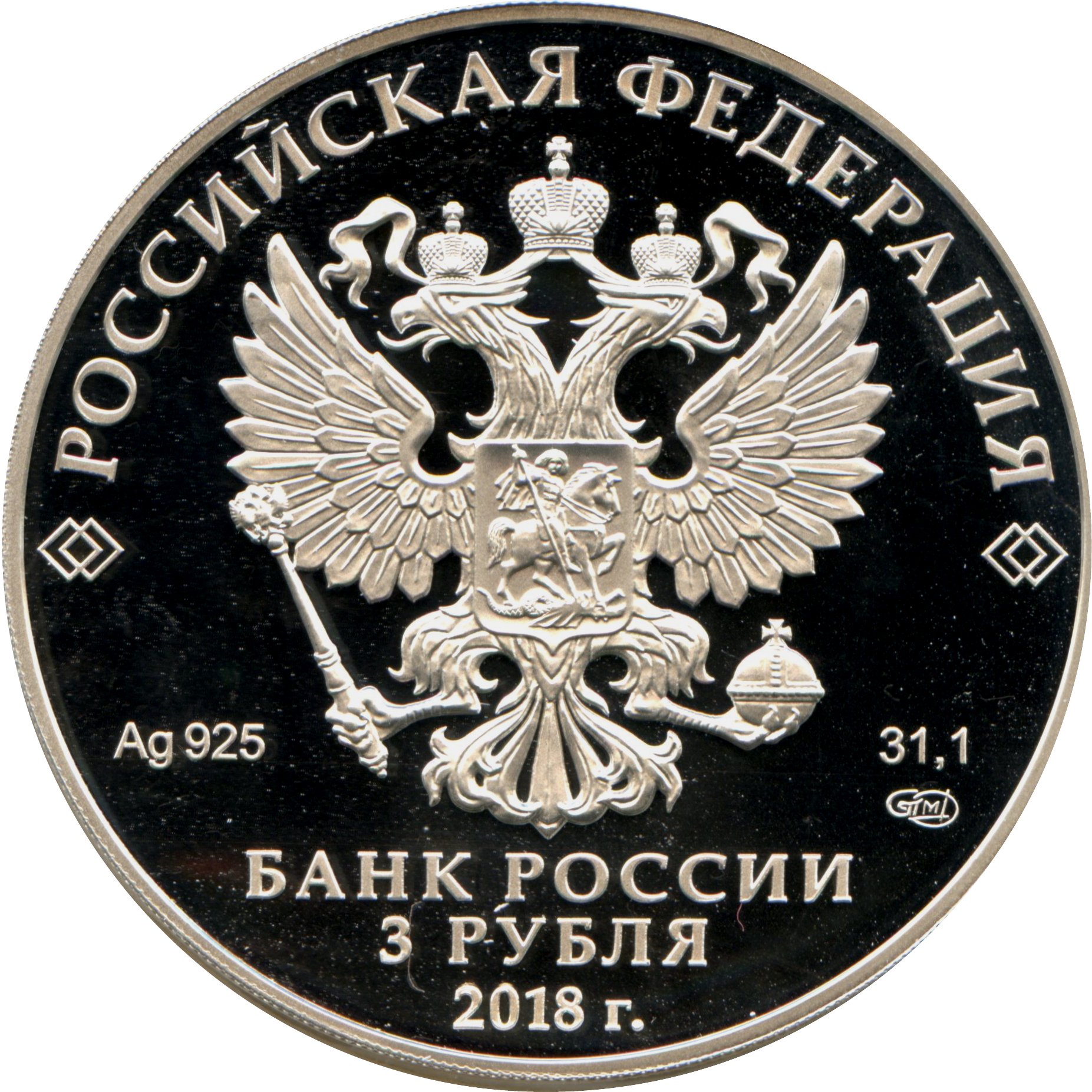 Описание: На дзеркальному полі диска – рельєфне зображення Державного герба Російської Федерації, над ним – напівкругла напис по колу: «РОССИЙСКАЯ ФЕДЕРАЦИЯ» (РОСІЙСЬКА ФЕДЕРАЦІЯ), обрамлене з обох боків подвійними ромбами, нижче під гербом: ліворуч – позначення дорогоцінного металу та його проби, праворуч – вміст дорогоцінного металу та знак монетного двору, внизу по центру, у три рядки – напис: «БАНК РОССИИ» (БАНК РОСІЇ), номінал монети: «3 РУБЛЯ» (3 РУБЛІ), рік.