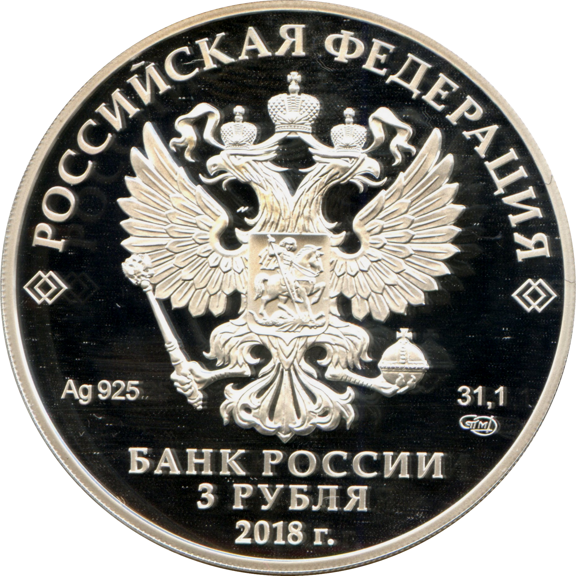 Описание: На дзеркальному полі диска – рельєфне зображення Державного герба Російської Федерації, над ним – напівкругла напис по колу: «РОССИЙСКАЯ ФЕДЕРАЦИЯ» (РОСІЙСЬКА ФЕДЕРАЦІЯ), обрамлене з обох боків подвійними ромбами, нижче під гербом: ліворуч – позначення дорогоцінного металу та його проби, праворуч – вміст дорогоцінного металу та знак монетного двору, внизу по центру, у три рядки – напис: «БАНК РОССИИ» (БАНК РОСІЇ), номінал монети: «3 РУБЛЯ» (3 РУБЛІ), рік.