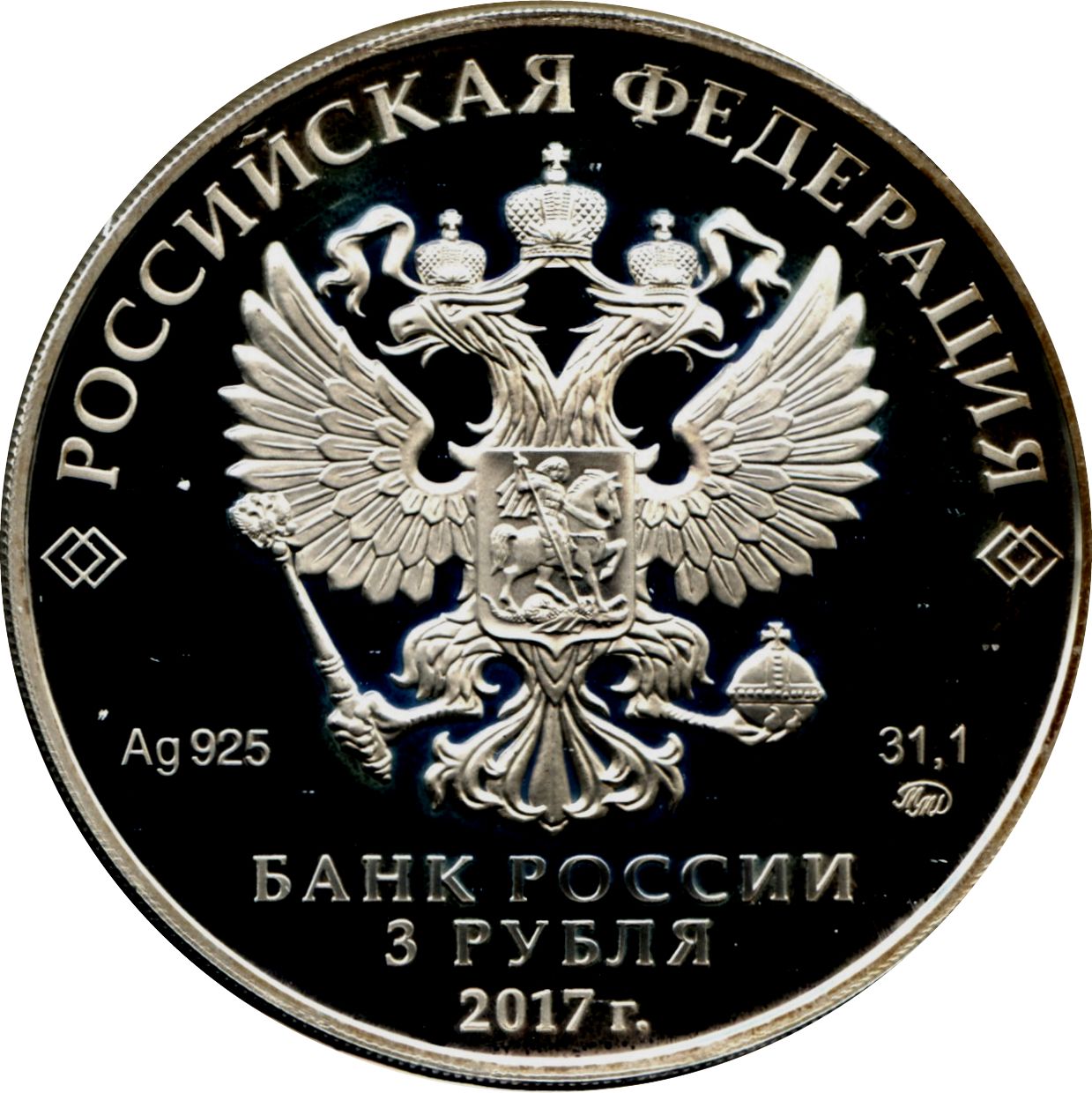 Описание: На дзеркальному полі диска – рельєфне зображення Державного герба Російської Федерації, над ним – напівкругла напис по колу: «РОССИЙСКАЯ ФЕДЕРАЦИЯ» (РОСІЙСЬКА ФЕДЕРАЦІЯ), обрамлений з обох боків подвійними ромбами, нижче під гербом: ліворуч – позначення дорогоцінного металу та його проби, праворуч – вміст дорогоцінного металу та торговельна марка монетного двору, внизу по центру, у три рядки – напис: «БАНК РОССИИ» (БАНК РОСІЇ), номінал монети: «3 РУБЛЯ» (3 РУБЛІ), рік.