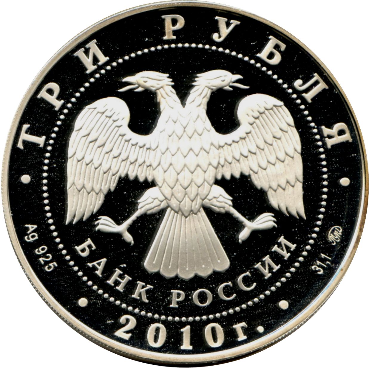 Описание: У центрі — емблема Банку Росії [двоголовий орел із розпростертими крилами, під ним — напівкруглий напис «БАНК РОССИИ» (БАНК РОСІЇ)], обрамлена колом з крапок, а по краю — написи: зверху: «ТРИ РУБЛЯ», нижче: ліворуч - позначення дорогоцінного металу та його проби, у центрі - рік випуску «2010 г.», праворуч - вміст дорогоцінного металу та знак монетного двору.
