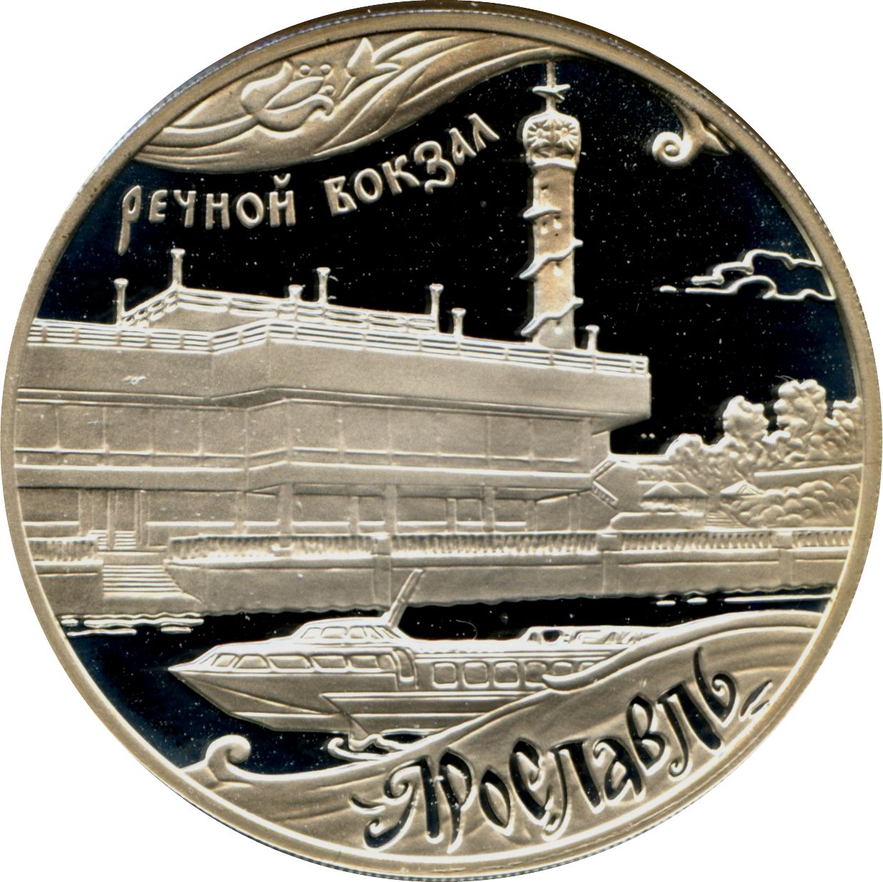 Описание: У центрі в рамці з рослинним орнаментом — будівля Ярославської річкової станції, над нею — напис: «РЕЧНОЙ ВОКЗАЛ» (РІЧКОВА СТАНЦІЯ), нижче на передньому плані — річкове судно з підводним крилом, під ним — напис: «ЯРОСЛАВЛЬ».