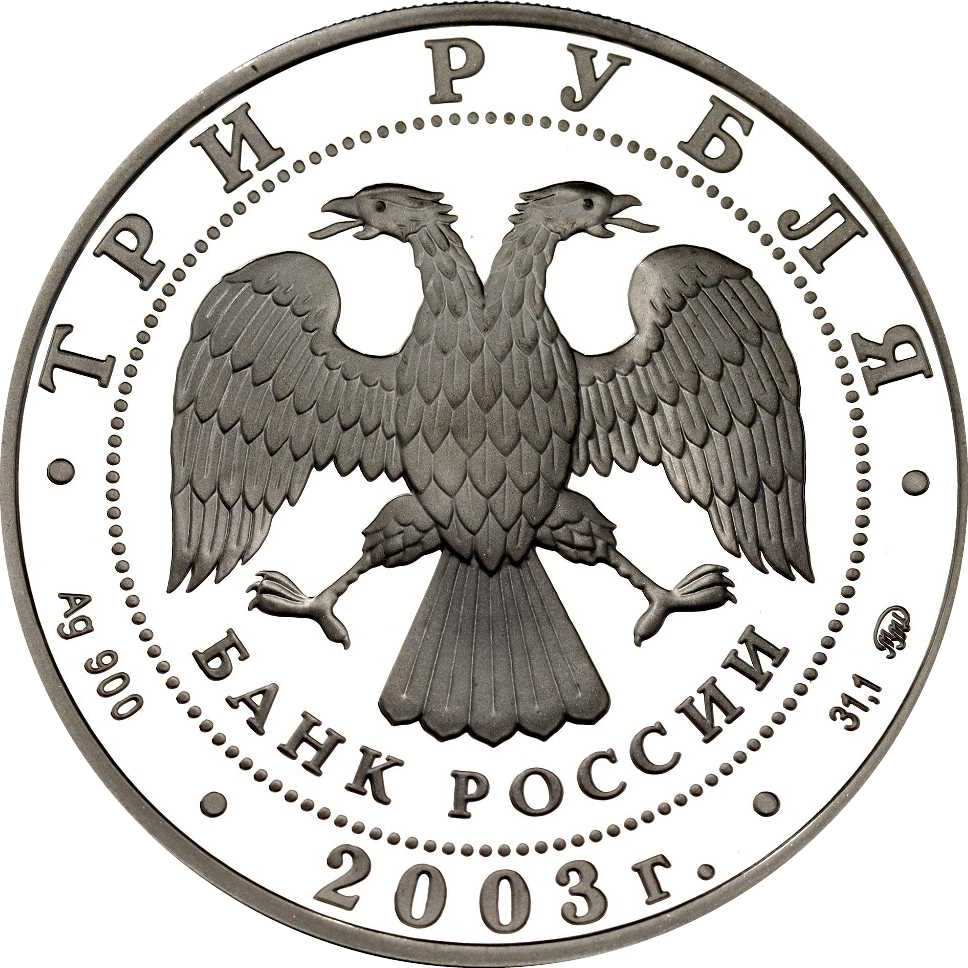 Описание: У центрі — емблема Банку Росії [двоголовий орел із опущеними крилами, нижче — напівкругла напис — «БАНК РОССИИ» (БАНК РОСІЇ)] в обрамленні кола з крапок і написів по краю: зверху — «ТРИ РУБЛЯ», внизу — рік випуску «2003», літери ліворуч позначають метал і пробу, праворуч — вміст дорогоцінного металу і знак монетного двору.