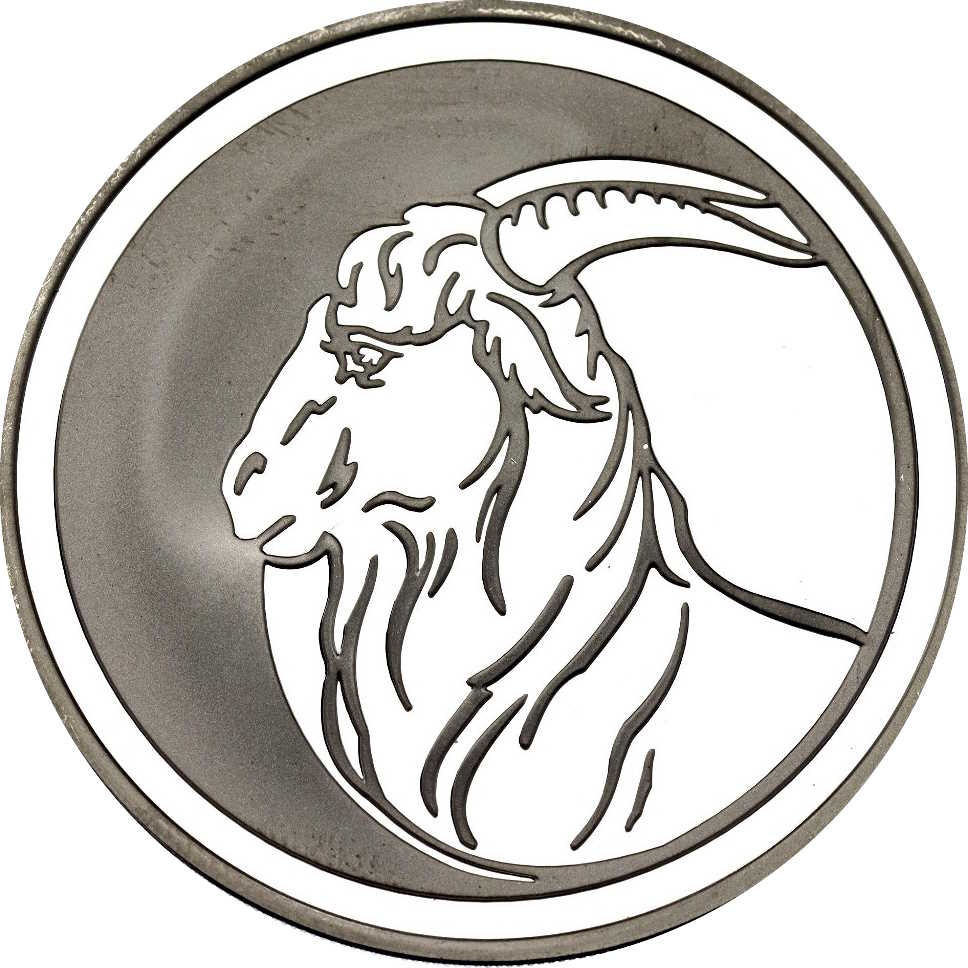Описание: Праворуч, у кільці, обрамленому суцільним обідком, — профільне зображення козла, ліворуч — матове зображення місячного півмісяця.