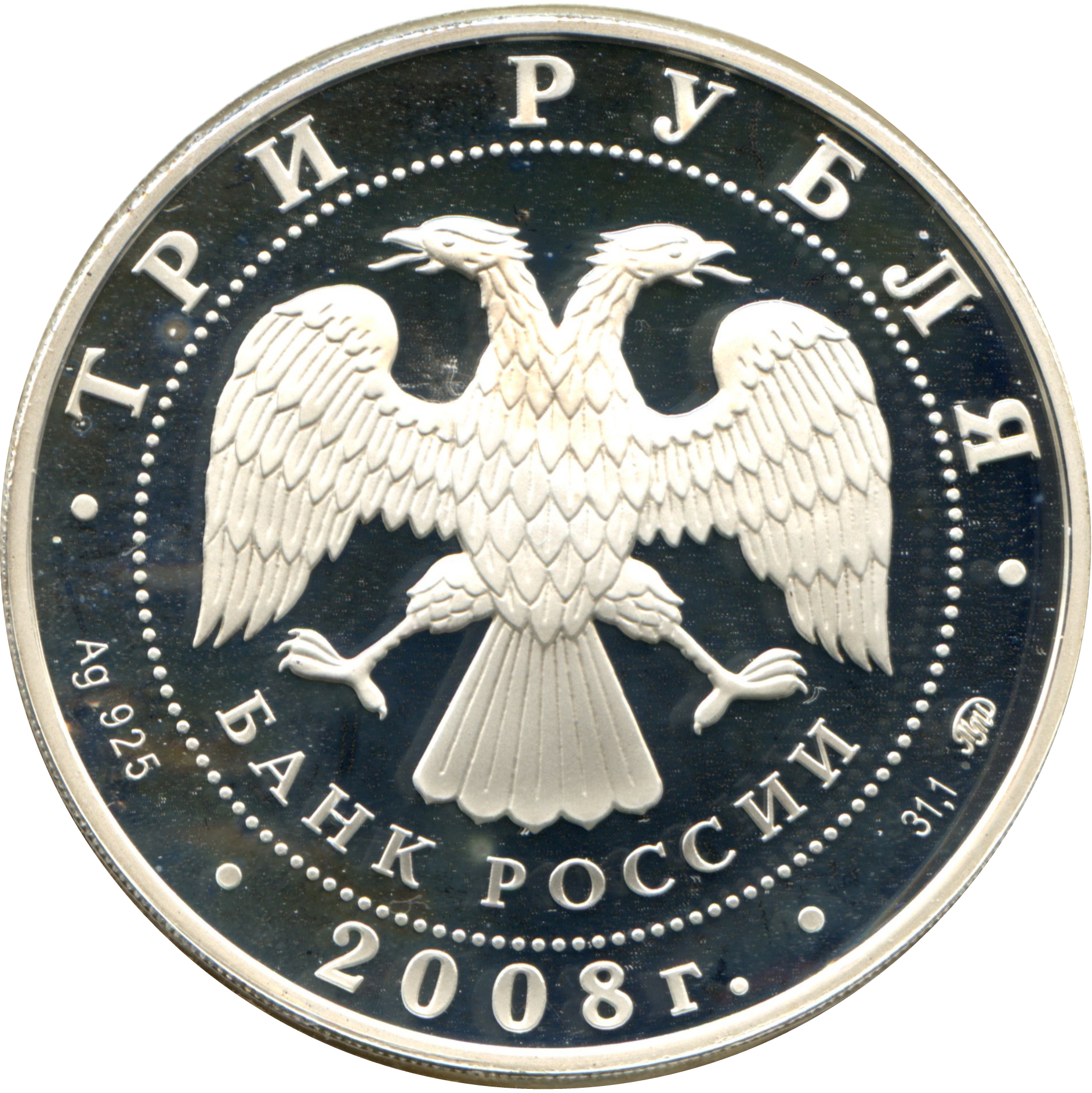 Описание: У центрі — емблема Банку Росії [двоголовий орел із опущеними крилами, під ним — напівкруглий напис «БАНК РОССИИ» (БАНК РОСІЇ)], обрамлена колом з крапок і написів по краю — зверху: «ТРИ РУБЛЯ» (ТРИ РУБЛІ), знизу: ліворуч – позначення дорогоцінного металу та його проби, у центрі – рік випуску «2008 г.» (2008), праворуч – вміст дорогоцінного металу та знак монетного двору.