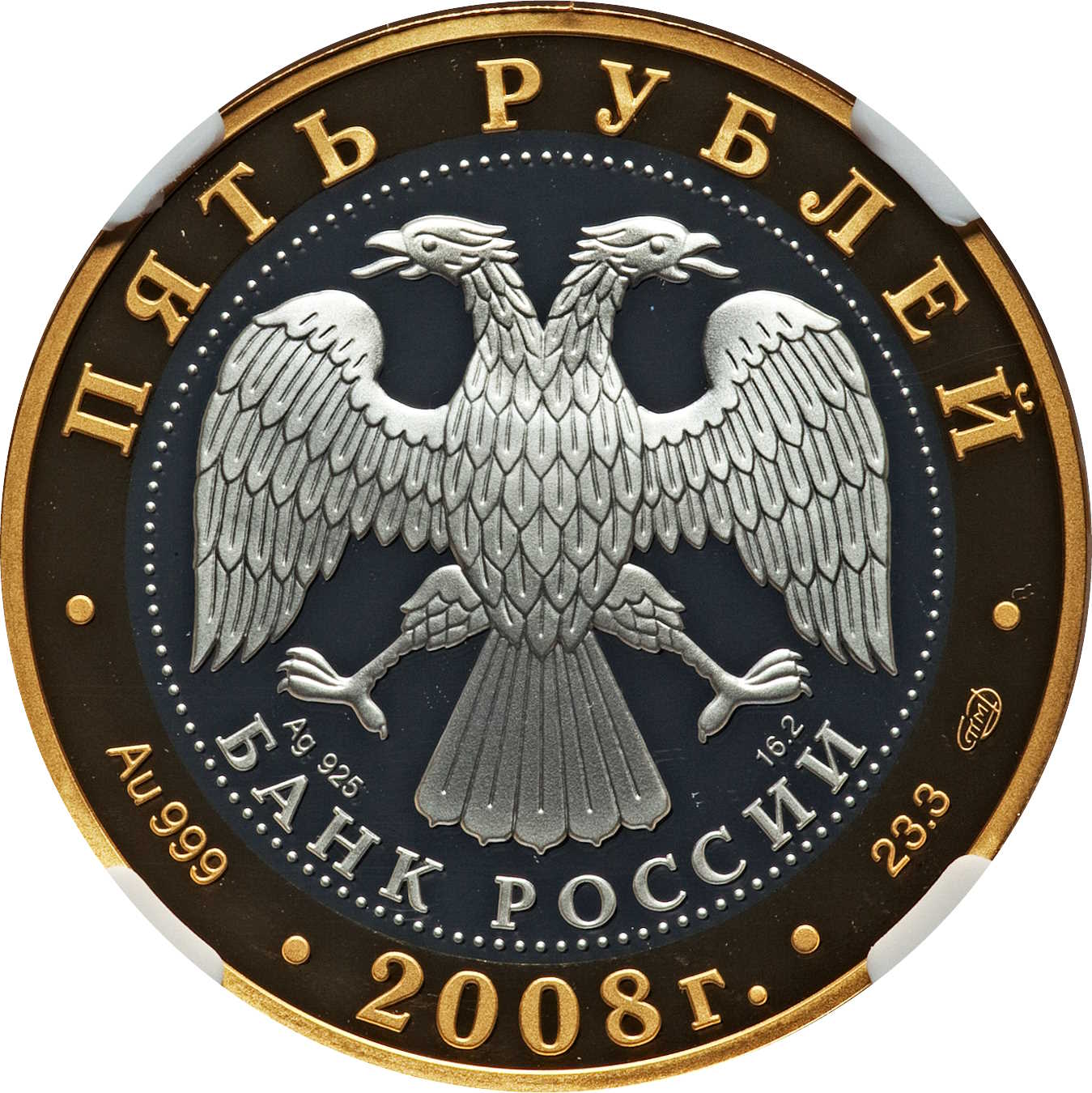 Описание: На диску — емблема Банку Росії [двоголовий орел з опущеними крилами, під ним — напівкруглий напис «БАНК РОССИИ» (БАНК РОСІЇ)], обрамлена колом з крапок, нижче: ліворуч — позначення металу та проби, праворуч — вміст дорогоцінного металу. Написи на кільці по краю - зверху: «ПЯТЬ РУБЛЕЙ» (П'ЯТЬ РУБЛІВ), знизу: ліворуч - позначення металу та проби, в центрі - рік випуску: «2008 г.» (2008), праворуч - вміст дорогоцінного металу та знак монетного двору.