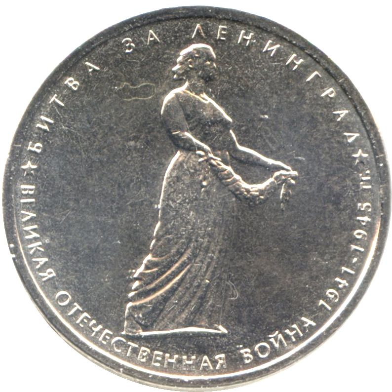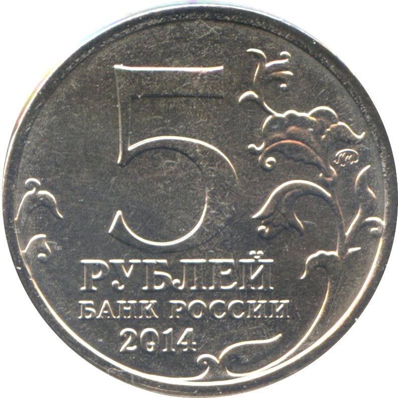 Описание: У центрі — позначення номіналу монети: «5 РУБЛЕЙ», нижче — напис: «БАНК РОССИИ» (БАНК РОСІЇ), під ним – рік випуску: «2014», ліворуч і праворуч – стилізована гілка рослини, праворуч по краю – знак монетного двору.