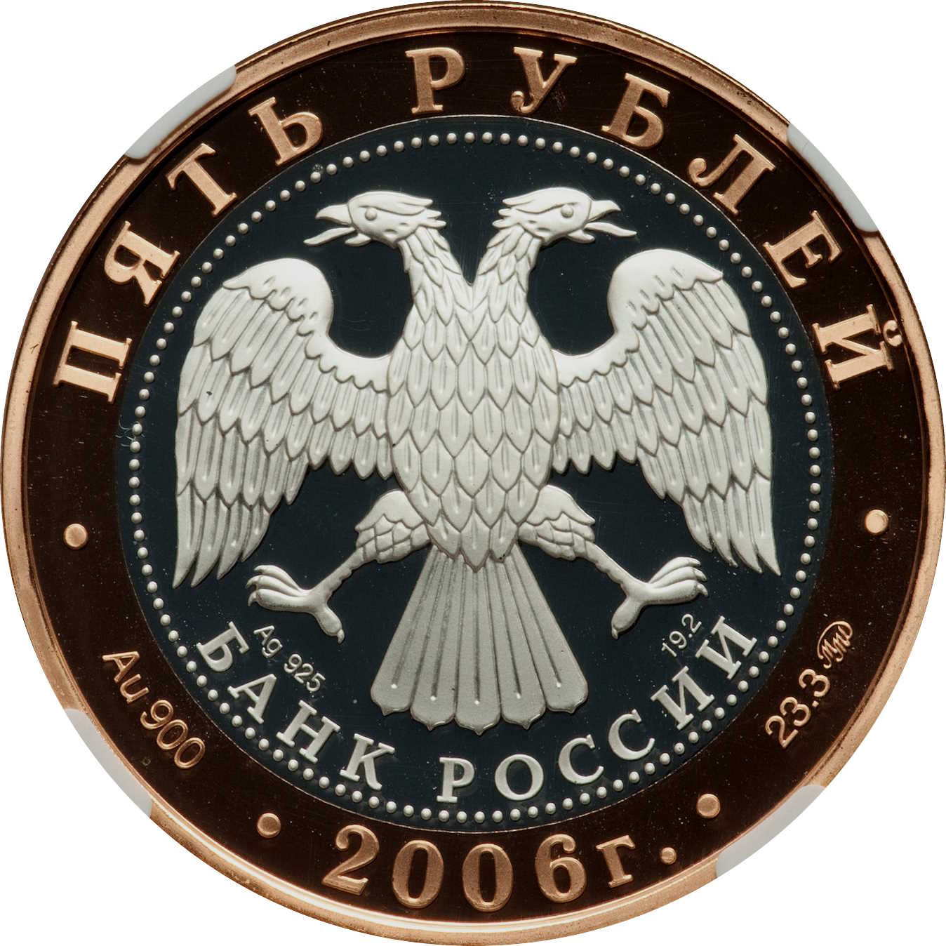 Описание: На диску – емблема Банку Росії [двоголовий орел з опущеними крилами, нижче – напівкруглий напис – «БАНК РОССИИ» (БАНК РОСІЇ)] в обрамленні кола з крапок, літери ліворуч позначають метал і пробу, праворуч – вміст дорогоцінного металу. Написи на кільці по краю: вгорі – «ПЯТЬ РУБЛЕЙ» (П'ЯТЬ РУБЛІВ), внизу – рік випуску «2006», літери зліва вказують на метал і пробу, справа – вміст дорогоцінного металу і знак монетного двору.