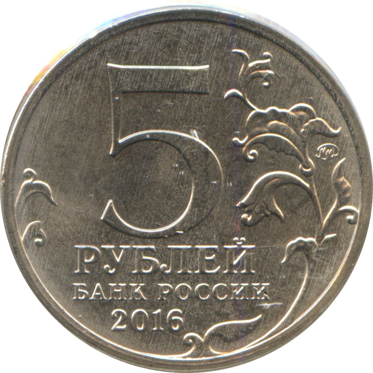 Описание: У центрі — зазначення номіналу монети у двох рядках: «5 РУБЛЕЙ», нижче — напис: «БАНК РОССИИ» (БАНК РОСІЇ), під ним – рік випуску: «2016», ліворуч і праворуч – стилізована гілка рослини, праворуч по краю – торговельна марка монетного двору.