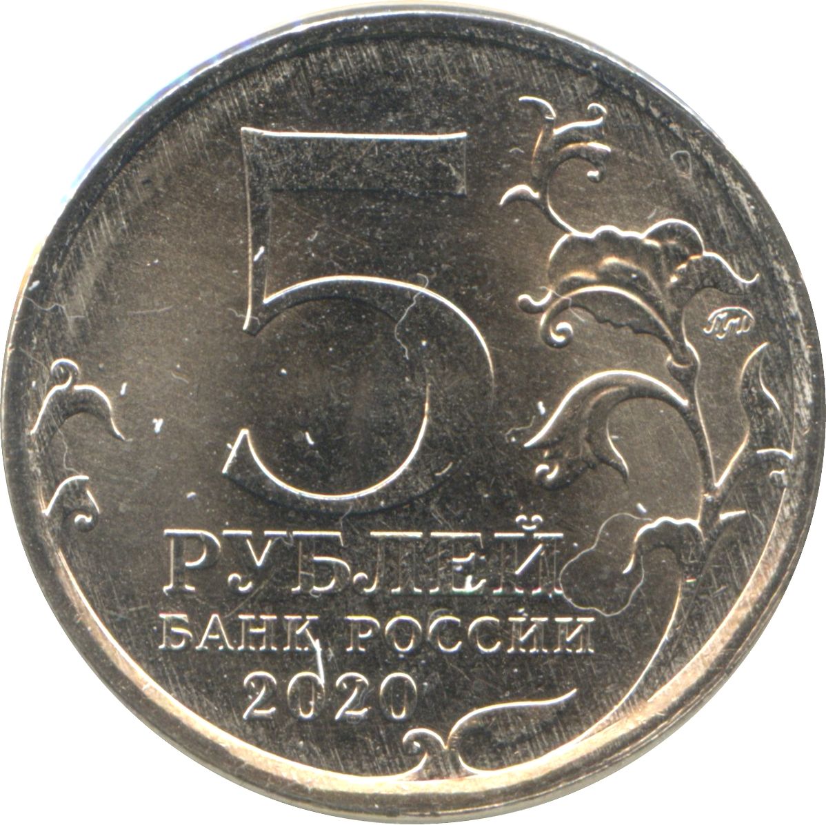 Описание: У центрі диска розміщено дворядковий напис із номіналом «5 РУБЛЕЙ» (5 РУБЛІВ) і «БАНК РОССИИ» (БАНК РОСІЇ) нижче, внизу — рік випуску «2020», зліва і справа — стилізовані зображення гілок рослин, а в правій частині монети — товарний знак Московського монетного двору.