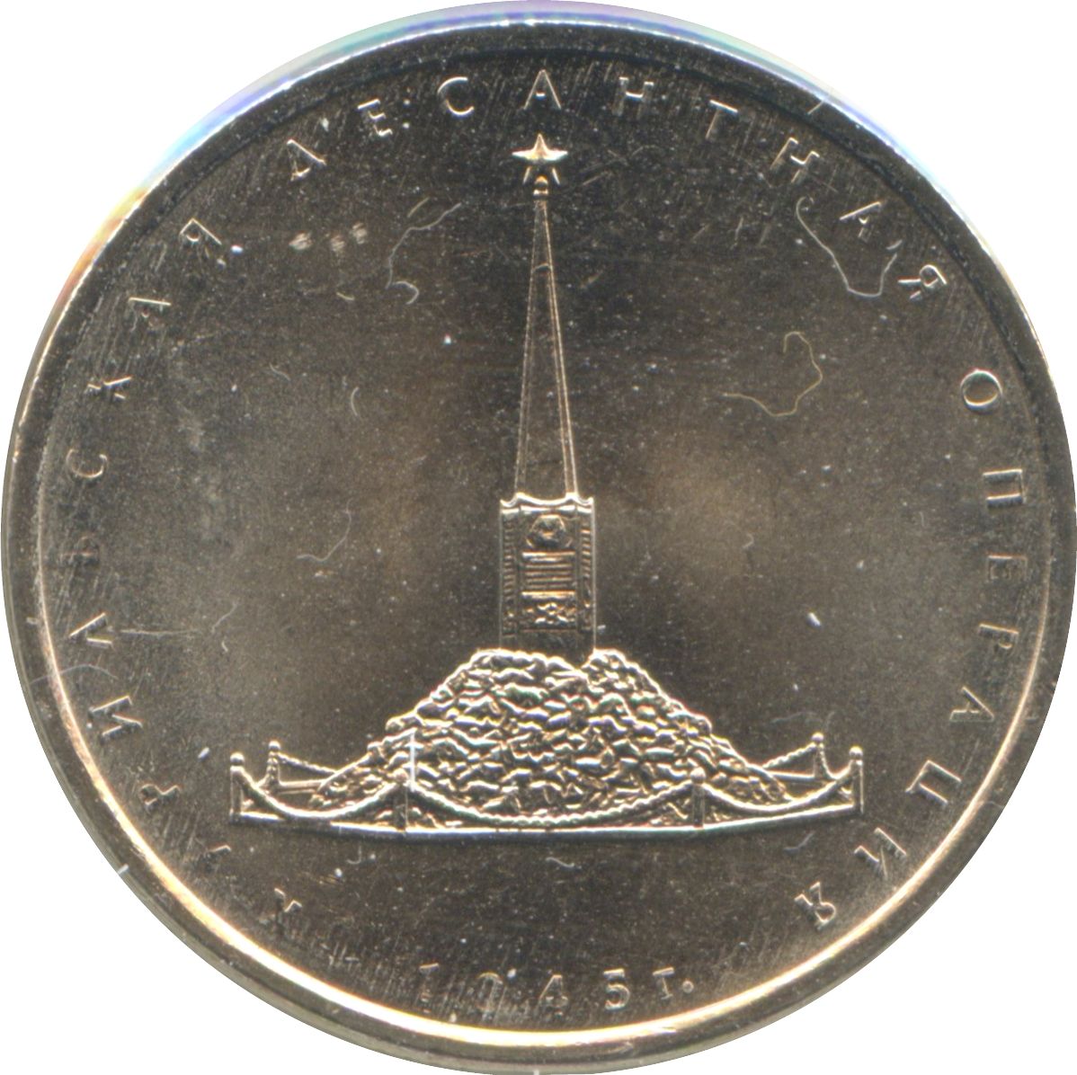 Описание: Рельєфне зображення пам'ятника солдатам Радянської армії — визволителям Курильських островів у 1945 році; по краю монети розміщені написи «КУРИЛЬСКАЯ ДЕСАНТНАЯ ОПЕРАЦИЯ» (КУРИЛЬСЬКА ДЕСАНТНА ОПЕРАЦІЯ) та «1945 г.» (1945).