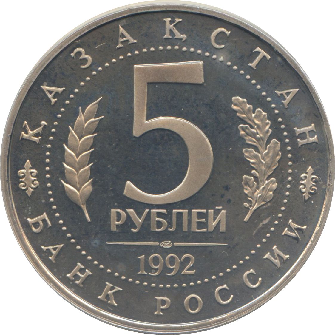 Описание: У центрі диска, в колі з крапками, номінал у двох рядках: «5 РУБЛЕЙ» (5 РУБЛІВ), обрамлене зліва колоссям пшениці, а справа — дубовою гілкою; під номіналом, підкресленим двома лініями з між ними торговою маркою монетного двору, — рік випуску: «1992»; по краю — напівкруглі написи, розділені двома фрагментами орнаменту, зверху: «КАЗАКСТАН» (КАЗАКСТАН – у транскрипції казахської мови), внизу: «БАНК РОССИИ» (БАНК РОСІЇ).