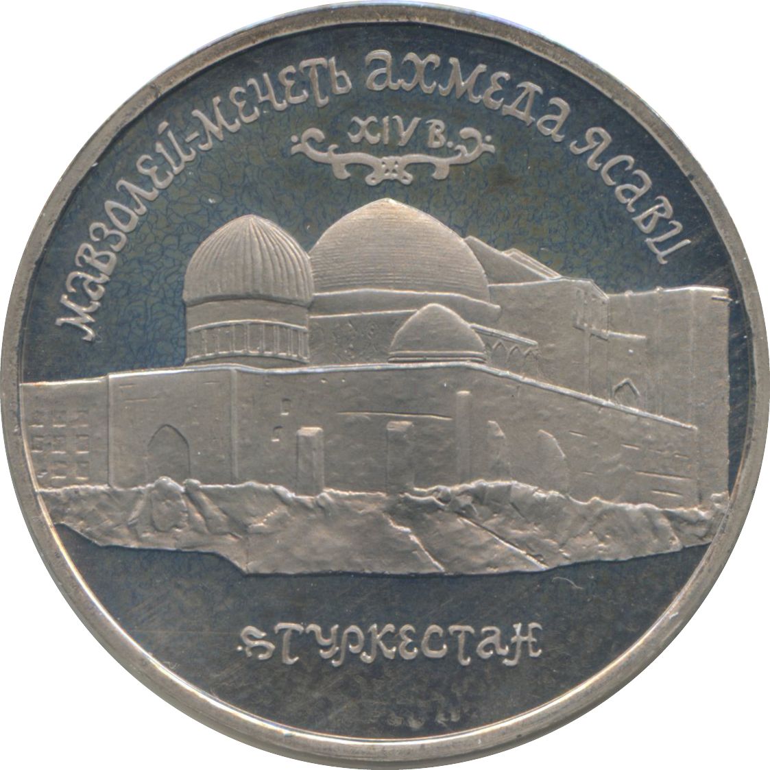 Описание: У центрі диска — рельєфне зображення мавзолею-мечеті Ахмеда Ясаві, вздовж верхнього краю — напис у східному стилі: «МАВЗОЛЕЙ-МЕЧЕТЬ АХМЕДА ЯСАВИ» (МАВЗОЛЕЙ-МЕЧЕТЬ АХМЕДА ЯСАВІ) під ним – дата: «XIV в.» (XIV ст.), підкреслена орнаментом, нижче – горизонтальний напис: «ТУРКЕСТАН» (ТУРКЕСТАН).