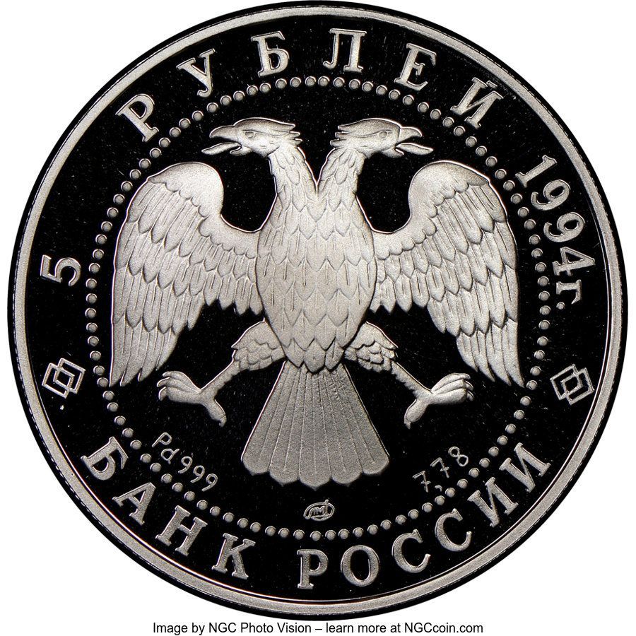 Описание: Двоголовий орел (за ескізом І. Білібіна), літери під ним позначають метал, пробу, знак монетного двору та вміст дорогоцінного металу. Написи по краю: зверху — «5 РУБЛЕЙ 1994 г.» (5 РУБЛІВ 1994), знизу — «БАНК РОССИИ» (БАНК РОСІЇ).
