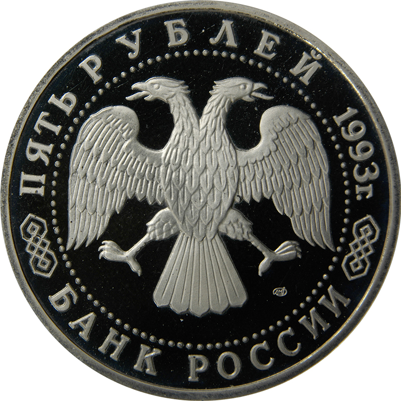 Описание: У центрі — емблема Банку Росії (двоголовий орел, розроблений І. Білібіним), під нею праворуч — знак монетного двору. Написи по краю, обрамлені колом з крапок: зверху — «ПЯТЬ РУБЛЕЙ 1993 г.» (П'ЯТЬ РУБЛІВ 1993), знизу — «БАНК РОССИИ» (БАНК РОСІЇ).