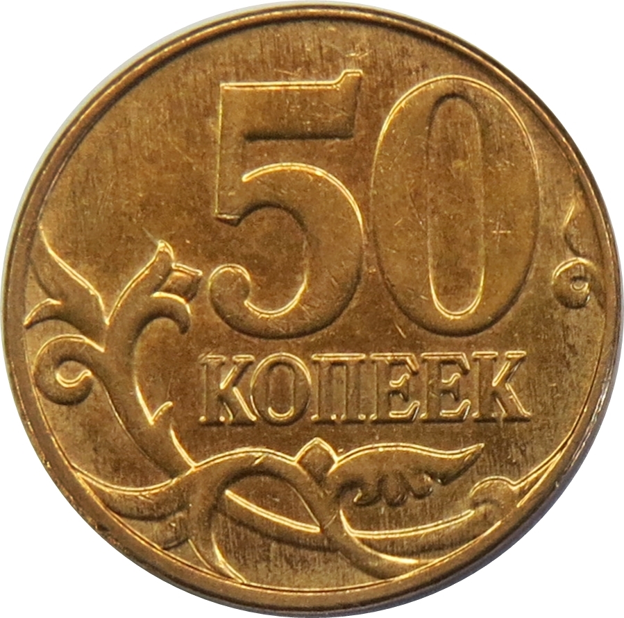 Описание: Трохи праворуч від центру знаходиться номінал монети: цифра 50 над написом «КОПЕЕК», написаним горизонтально внизу диска, та стилізований рослинний орнамент у вигляді двох гілок нижче.