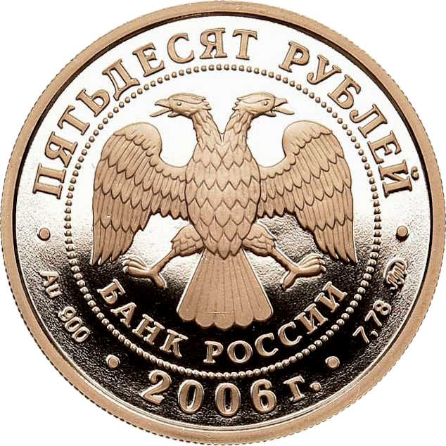Описание: У центрі — емблема Банку Росії [двоголовий орел із опущеними крилами, нижче — напівкруглий напис — «БАНК РОССИИ» (БАНК РОСІЇ)] в обрамленні кола з крапок і написів по краю: зверху — «ПЯТЬДЕСЯТ РУБЛЕЙ» (П'ЯТДЕСЯТ РУБЛІВ), внизу – рік випуску «2006», літери ліворуч позначають метал і пробу, праворуч – вміст дорогоцінного металу і знак монетного двору.