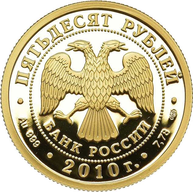 Описание: У центрі — емблема Банку Росії [двоголовий орел із опущеними крилами, під ним — напівкруглий напис «БАНК РОССИИ» (БАНК РОСІЇ)], обрамлена колом з крапок і написів по краю — зверху: «ПЯТЬДЕСЯТ РУБЛЕЙ» (П'ЯТДЕСЯТ РУБЛІВ), нижче: ліворуч - позначення дорогоцінного металу та його проби, в центрі - рік випуску «2010 г.» (2010), праворуч - вміст дорогоцінного металу та знак монетного двору.